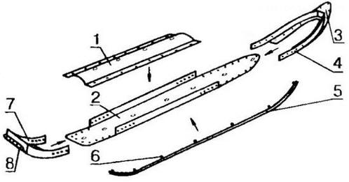 Основные детали конструкции лыж: 1 - усилитель, 2 - подошва (Д16Т, лист s2,5), 3 носок (Д16Т, лист s2,5), 4. 7 -бортики (Д16Т, лист s2,5), 5 - подрез (Ст3, труба 15x2), 6 - шпилька М6, 8 - задник (Д16Т, лист s2,5)