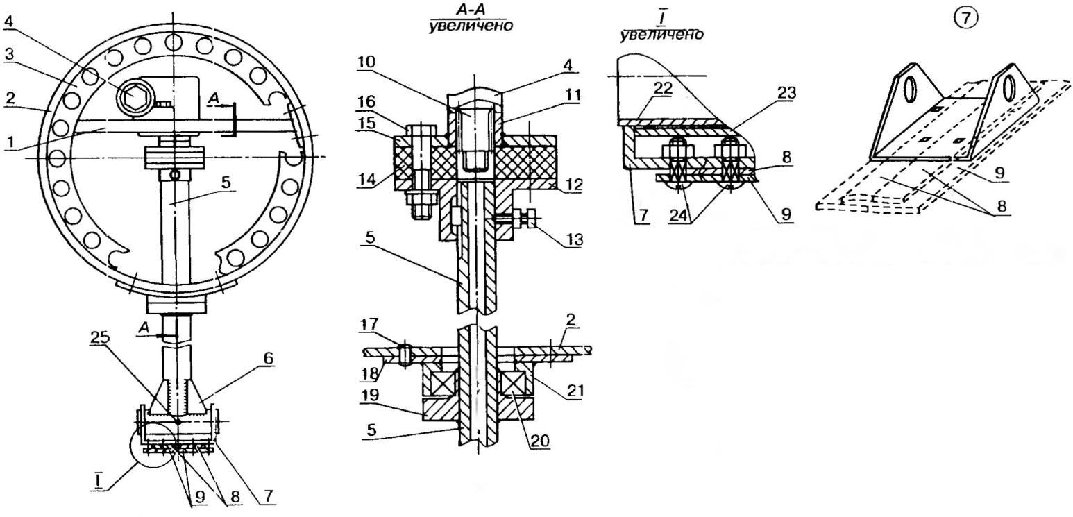Передний опора (вид спереди, носовой обтекатель снят) (нажмите для увеличения): 1 -балка съемная сварная поперечная (Ст3, s1,5), 2- обшивка корпуса (Д16Т, лист s2), 3 - шпангоут (Ст3, лист s1,5), 4 - корпус рулевого механизма, 5 - стойка (сталь 45, труба 27x4,5), 6 - подкос (Ст3, лист s 1,5), 7 - кронштейн (Ст3, лист s3), 8 - подрессорники, 9 - рессоры, 10 - хвостовик рулевого механизма, 11 - втулка шлицевая (головка рулевой сошки), 12 - фланец нижний (Ст3), 13 - стопор (болт М6), 14 - подушка (резина), 15 - фланец верхний (Ст3), 16 - болт М8 (4 шт.), 17 - заклепка (Д18, 05, 16шт.), 18 - фланец корпуса подшипника (Ст3, лист s3), 19 - опора подшипника (Ст3), 20 - подшипник 46206,21 - корпус подшипника (Ст3), 22 - ось (Ст3, труба 30x2,5), 23 - корпус шарнира (Ст3, труба 36x3), 24 спецболты крепления рессор (М8), 25 - масленка