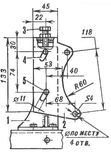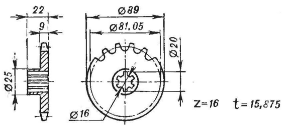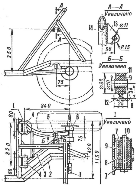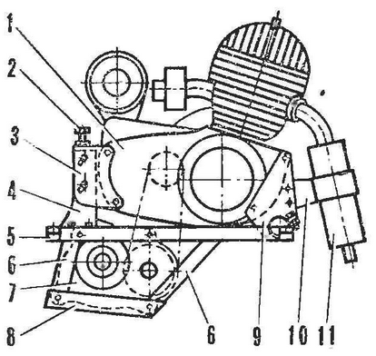 На задней части рамы на самодельных резиновых подушках смонтирована лодмоторная рама с силовой установкой от мотоколяске СЗД, развернутой на 180°. Передняя стойка ее крепления - переходник, смещенный вертикально относительно кронштейна крепления двигателя. Задняя точка - шарнирная: кронштейн, охватывая хомутом трубу подмоторной рамы, допускает небольшой поворот силовой установки в вертикальной плоскости. Так сделано для натяжения приводной цепи регулировочным винтом, который, отжимаясь от опорной площадки переднего кронштейна. приподнимает двигатель. Фиксация степени натяжения цепи осуществляется хомутом и стяжными шпильками (см. рис. 9 и рис. 10). Крутящий момент передается роликовой однорядной целью с шагом 15,875 мм дифференциалу с реверс-редуктором от грузового мотороллера. Дифференциал подвешен на четырех шпильках под двигателем на тягах подмоторной рамы. В принципе он мало чем отличается от мотоколясочного - такой же компактный и надежный. Однако для получения требуемого числа оборотов колес пришлось изготовить для него новую звездочку с 16 зубьями.