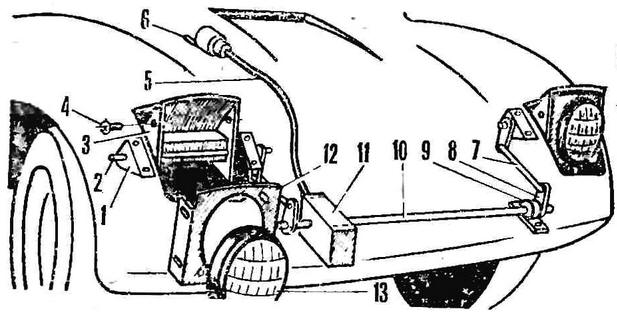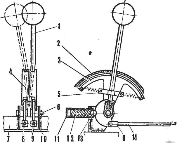 Коробка передач, как известно, встроена непосредственно в двигатель, а реверс - в дифференциал. Для управления ими необходимо иметь два рычага с раздельным приводом. Я же применил единый привод переключения и передач, и реверса, что намного упростило управление автомобилем. Рычаг переключения в кабине установлен шарнирно между двумя секторами передач и реверса и постоянно прижат пружиной к первому. В нейтральном положении секторы фиксируются шариками, которые под действием своих пружин входят в канавки дисков.