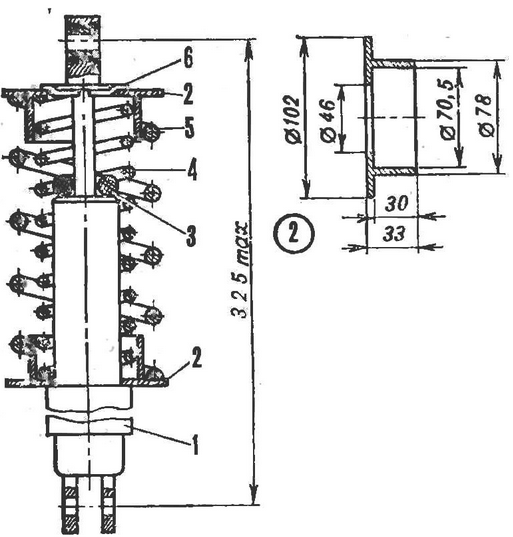 Задний мост "Мышонка-2" сильно загружен, и упругости амортизаторов от мотоцикла "Урал", как выяснилось, недостаточно. Поэтому их пришлось доработать - установить дополнительные пружины, которые я сделал из одной пружины задней подвески автомобиля ЗАЗ-968, разрезав ее газовой горелкой. Края разрезов, пока они были горячие, подогнул, а затем обточил на наждаке для точной посадки в тарелки. Более сложной переделке амортизаторы не подвергались. Я удалил лишь наружные кожухи. А чтобы грязь не попадала на штоки, применил защитные чехлы из тонкой парусины.