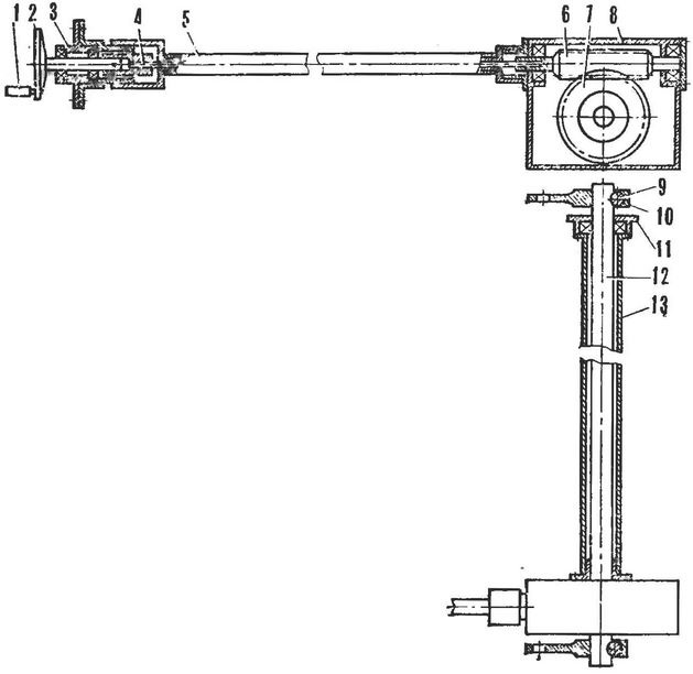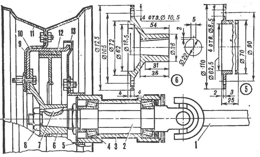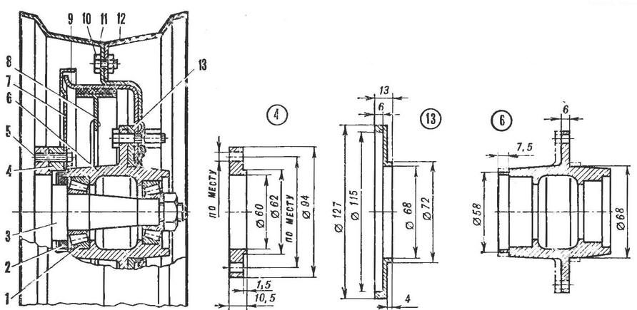 Силовые полуоси с карданными шарнирами - также от грузового мотороллера. Но поскольку колея "Мышонка" шире, то их пришлось удлинить. Полуоси я разрезал пополам и впрессовал в стальную втулку. Подогнав их длину по месту, приварил друг к другу. Подвески передних колес собраны из деталей ходовой части мотоколясок СЗА и СЗД. Для соединения их между собой я выточил дополнительные фланцы и кольца-проставки. Детали ходовой части (кроме ступиц) не дорабатывал. А ступицы лишь обточил в трех местах, как показано на рисунке. Любопытным элементом моей машины можно считать выдвижные фары. Подобные иногда встречаются в самодельных конструкциях. Днем, когда света достаточно, фары спрятаны в подкапотном пространстве, в вечернее же время их выдвигают наружу. Фары у меня пока с ручным приводом (со временем он будет заменен на электрический), установленным в кабине. От вертушки к червячному редуктору с передаточным отношением 1 : 80 тянется тросик спидометра в оболочке. Далее, от червячного колеса редуктора вращение валом, спрятанным в распорной втулке, через рычаги и тяги передается корпусам фар, и те выдвигаются. Регулируются они смещением полок, которые фиксируются затем боковыми винтами крепления. Автор: В.Веселов