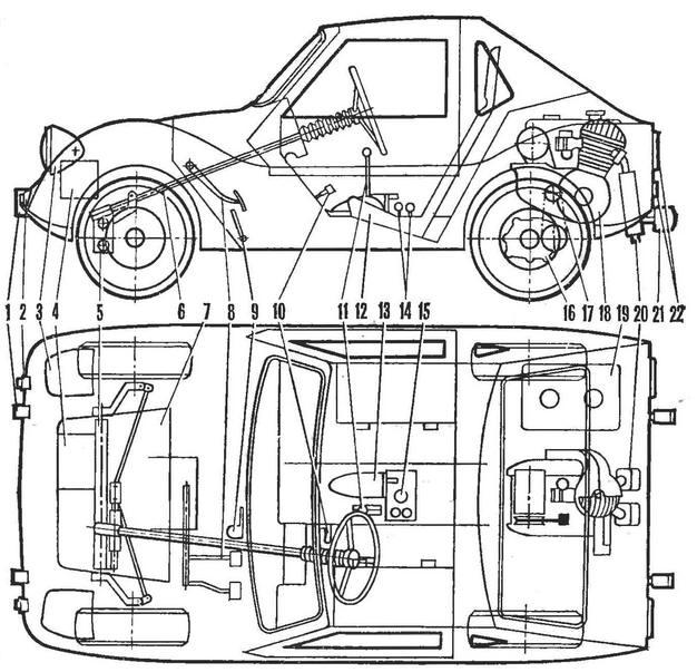 Теперь хотелось бы рассказать об особенностях конструкции "Мышонка-2". Он собран в основном из запасных частей "Запорожца" и мотоколясок СЗА и СЗД. Кузов каркасный, с панелями из стеклопластика на трубчатом остове. Задний капот откидной или съемный, что обеспечивает свободный доступ к двигателю. Кузов - самая трудоемкая часть, на его сборку и оборудование затрачено три четверти времени.