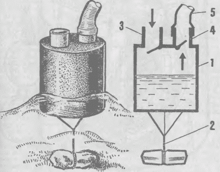 Многие современные устройства, использующие энергию морских волн, берут свое начало от установки, предложенной еще К. Э. Циолковским. Вот принцип ее действия. Посмотрите на рисунок 1. В воде плавает перевернутый бочонок, закрепленный при помощи каната. Он качается на волнах, уровень воды в его полости постоянно меняется. Образуется как бы водяной поршень. Достаточно установить в его днище впускной и выпускной клапаны, закрепить шланг, и вот уже бочонок превратился в воздушный насос. Энергия волн преобразуется в энергию сжатого воздуха, который по шлангу можно направить в необходимое нам место.