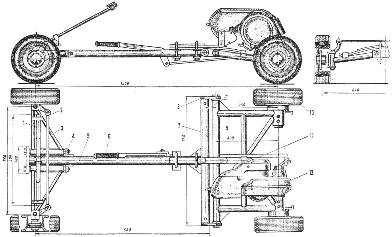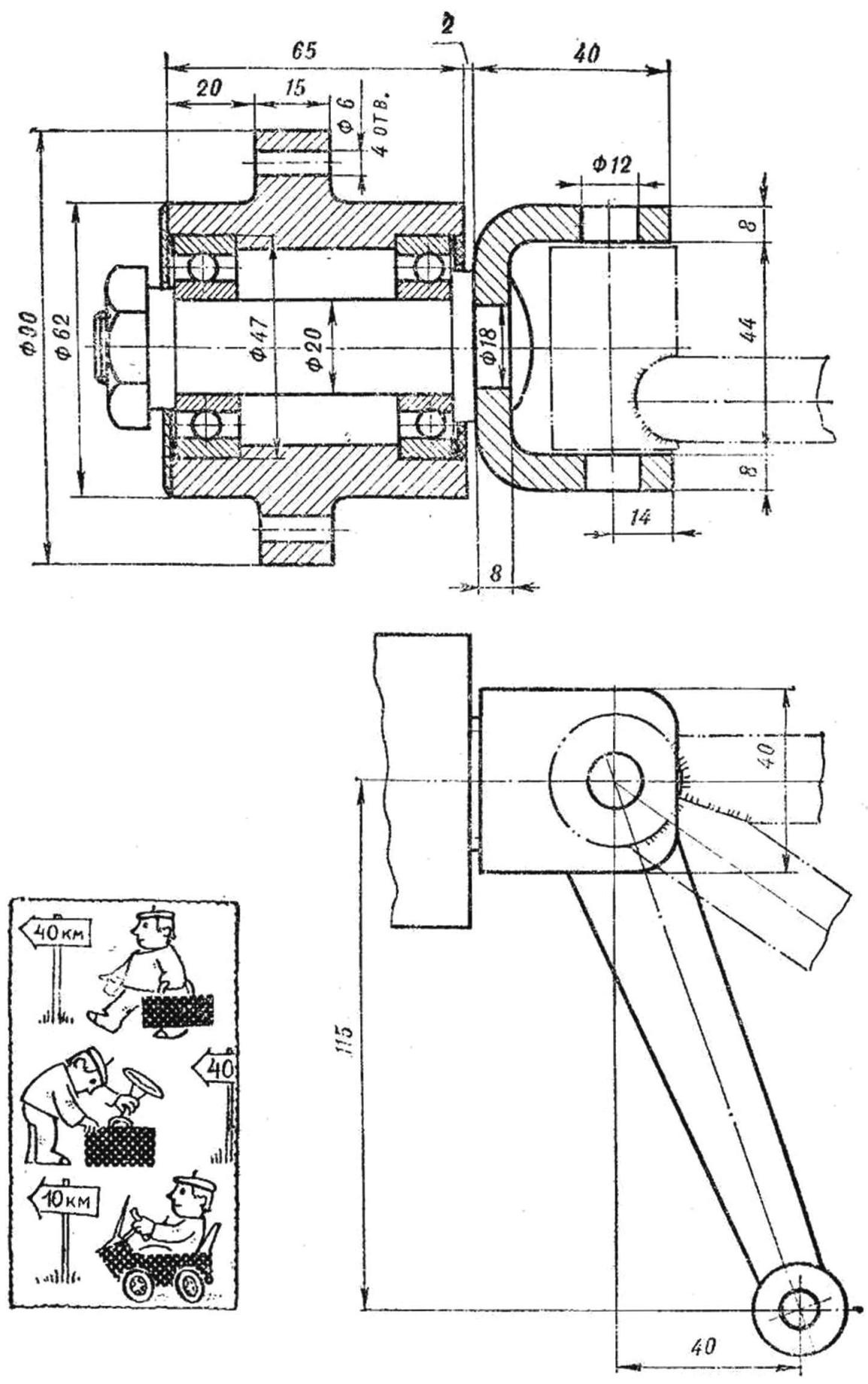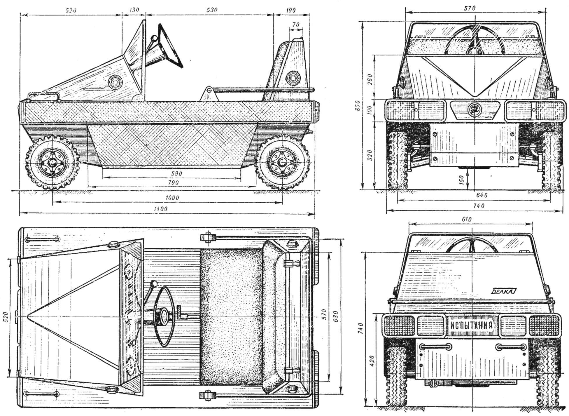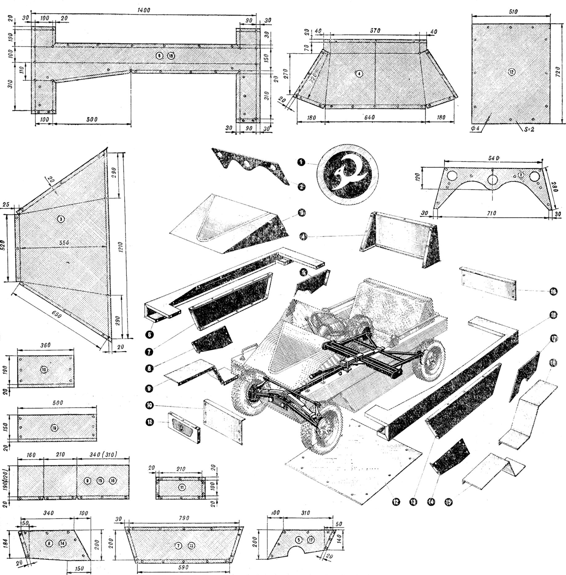 И последнее, что побудило взяться за разработку трансформируемого микроавтомобиля, - это проблема хранения. Число наших разработок медленно, но неуклонно возрастало; несколько машин мы держали в лаборатории, остальные - в гараже. Интерес к ним пропадал, поскольку ребятам хотелось попробовать силы в строительстве именно своего автомобиля, и постепенно труд нескольких поколений кружковцев превращался в металлолом. Все это и заставило нас обратиться к принципиально новой идее - спроектировать многоцелевой блочный (модульный) автомобиль. Были, правда, и возражения: некоторые думали, что проектирование такой машины поставит юного конструктора в жесткие рамки, мешающие полету творческой фантазии. Но большинство ребят склонилось к мысли, что этого не произойдет. Наоборот, ограничения в конструкции дадут возможность юному автостроителю проявить максимум изобретательности при проработке собственного варианта на базе стандартного набора элементов. Давайте теперь мысленно откроем коробку-кузов и рассмотрим, из чего складывается основа автоконструктора. Кузов "Белки"-грузовичка представляет собой ящик, собранный из шестимиллиметровой фанеры и окантованный дюралюминиевым уголком. Сверху лежат детали водительского кресла - спинка и сиденье. Они простые - основание (фанера толщиной 6 мм) с наклеенным на него поролоном обтянуто искусственной кожей красного цвета. Габаритные размеры сиденья 570х300 мм. Под деталями сиденья лежит стальной лист 720х510 мм толщиной 2 мм, оклеенный с одной стороны рифленой резиной, - это днище автомобиля. Двенадцать отверстий Ø 4 мм по кромке листа предназначены для крепления пола к кузову. Вынув днище, вы обнаружите под ним шесть бортовых панелей, являющихся основой кузова автомобиля, поскольку практически все остальные элементы корпуса крепятся к ним. В центре ящика между бортовыми панелями оставлено место для четырех колес 3,50-5 модель В-25 А. В них вложены восемь колесных дисков и две ступицы с подшипниками и осями в сборе с поворотными цапфами и продольными тягами. Еще ниже лежат две качалки переднего моста, сваренные из газовых труб с внешним Ø 20 мм. Здесь же находится и подмоторная рама, служащая одновременно основанием заднего моста и его подвеской. Сварена она из газовый труб Ø 30 мм. В тот же ящик-кузов уложена и хребтовая рама автомобиля квадратного сечения 40х40 мм с приваренными к ней проушинами для крепления качалок переднего и заднего мостов. Под рамой лежат две рессоры (передняя - поперечная и задняя - продольная) и четыре стремянки с наклад" нами для крепления подвески к раме. Полосы рессор можно подобрать от автомобиля "Москвич" любой марки. В комплект конструктора входят также рулевое колесо, рулевая колонка с кронштейнами и поводками и поперечные тяги с шарнирами. В отдельном пакете - педали управления дроссельной заслонкой карбюратора, сцеплением и тормозами. На самое дно кузова уложены панель капота, ветровое стекло, задняя опора спинки сиденья (она же - капот бензобака), передние и задние крылья, приборный щиток и два стальных уголковых профиля 20х20 мм длиной 720 мм. В специальном отсеке находятся фары и подфарники, габаритные огни, тросы, спидометр, тумблеры, комплект элементов электропроводки и пакет крепежных деталей - болтов, винтов, шайб и гаек. Не забыты и торцевые гаечные ключи, отвертки. Д