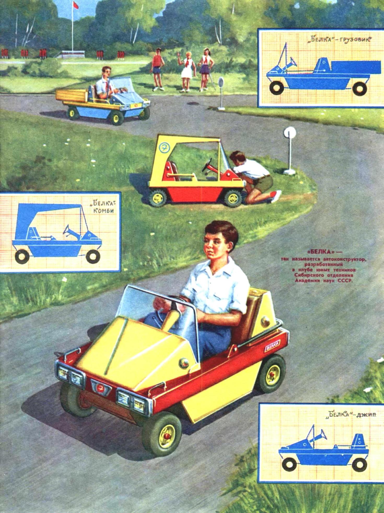 Модульный микроавтомобиль Белка. Личный транспорт Справочник / Личный транспорт: наземный, водный, воздушный У этого небольшого, изящного прогулочно-спортивного "джипа" всего за полчаса можно коренным образом изменить весь облик. Стоит переставить два-три элемента конструкции - и перед вами багги. А если появится желание прекратить "Белку" в туристский автомобиль, то достаточно установить на нее съемный тент-обтекатель. Без особого труда превращается она и в легкий грузовичок. При необходимости автомобиль легко разбирается и складывается в собственный грузовой кузов, как в коробку. Несмотря на сравнительно небольшие размеры ("Белка" свободно размещается даже на письменном столе!), это не игрушка, а самый настоящий автомобиль. Его скорость около 40 км/ч, а горючего в бензобаке хватает на 100 км пути. Как возникла идея модульного автомобиля? Прежде всего нас не устраивали сроки проектирования и строительства "традиционных" машин - наши мальчишки успевали вырасти, окончить школу и уйти из клуба, так и не сев ни разу за руль. Не подходили для нас и схемы с использованием каркаса и нетехнологичных в условиях кружка профилированных панелей. Такие конструкции, помимо того, что на их воплощение требуется слишком много времени и сил, к тому же абсолютно неизменяемы - другую машину сделать на базе старой весьма затруднительно. Строить же новый автомобиль без использования элементов старого накладно.