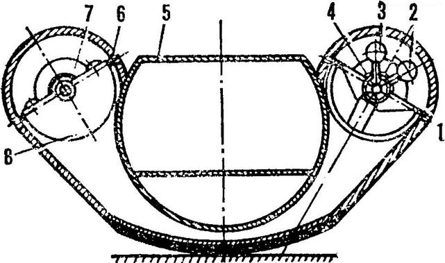 В одном из первых проектов, защищенных, кстати, авторским свидетельством № 347232, уже были заложены все основные моменты конструкции, которая подразумевается сегодня под словом "католет". Здесь предусматривался и корпус-полумяч, и отнесенный от центра масс двигатель, и маятниковая схема движения корпуса аппарата. На приводимой схеме-разрезе (рис. 1) наглядно представлены главные элементы и узлы этого транспортного устройства.