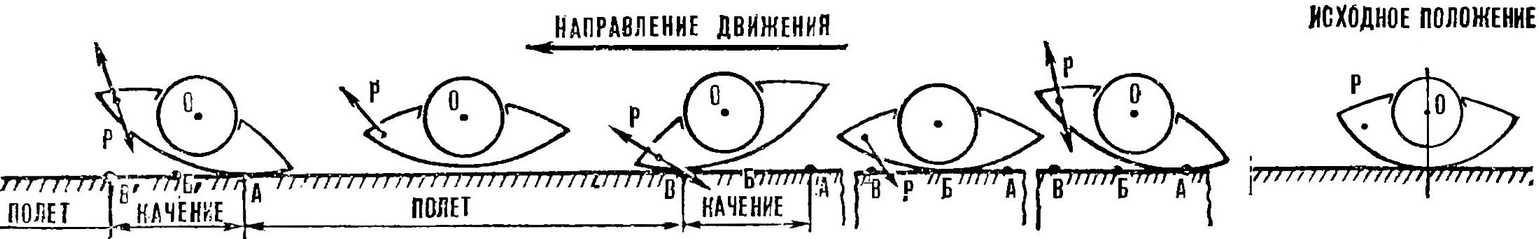 Интересно проследить по приводимой схеме (рис. 3) последовательную смену фаз движения католета. В начальной фазе центробежная сила, создаваемая дебалансами, должна приподнять "переднюю" часть машины (передней у нее могут стать все). Тогда при последующем нижнем положении дебалансов направляющая будет устремлена вниз - начнется перекатывание корпуса по сферическому днищу до упора "передней" частью в поверхность, по которой происходит движение. В этот момент при верхнем расположении дебалансов направляющая окажется устремленной снова вверх и начнет поднимать корпус. Происходит как бы зависание с одновременным небольшим перемещением вперед - полет. Затем снова опора на "заднюю" часть сферического днища - и повторение цикла движения.