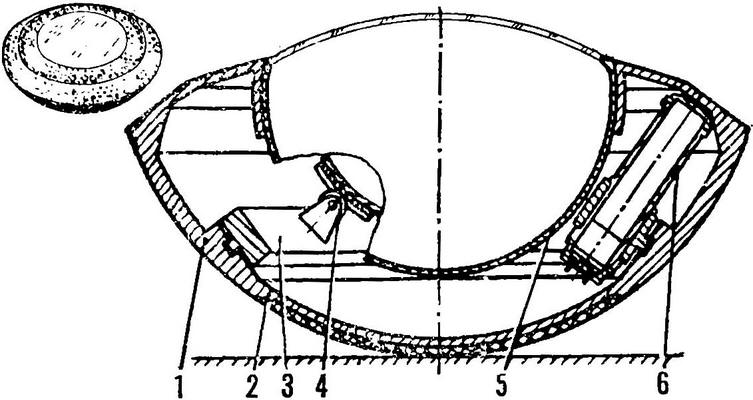 Рис. 2. Католет - "юла" (внешний вид и схема): 1 - корпус-полусфера, 2 - криволинейное днище, 3 - подвижное кольцо, 4 - ролик, 5 - кабина, 6 - двигатель