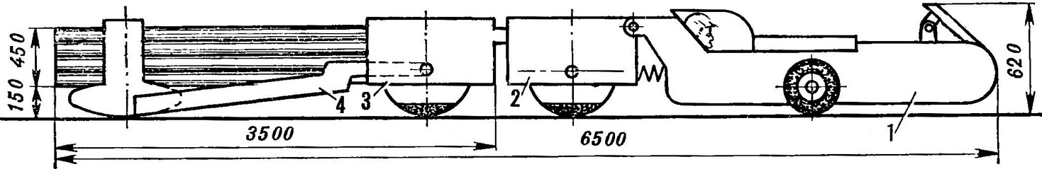 Как уже упоминалось, католеты начинают выходить из стадии действующих моделей. На рисунке приведена схема шахтного поезда на основе католета. Главную его часть составляют две католетные тележки: активная - движущая и пассивная, являющаяся головной частью грузового прицела. Кабина водителя вынесена вперед и не зависит от остальной части состава. Такой поезд рассчитан на транспортировку материалов в гидрошахтах, то есть на эксплуатацию в стесненных, затрудненных для других видов тягачей условиях.