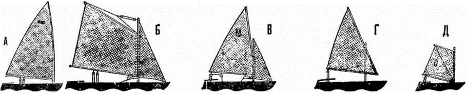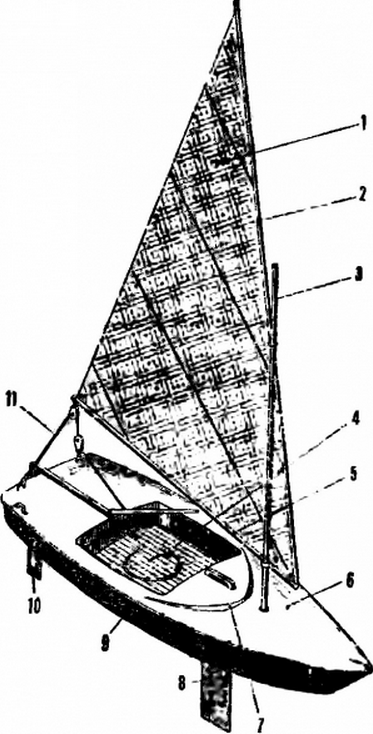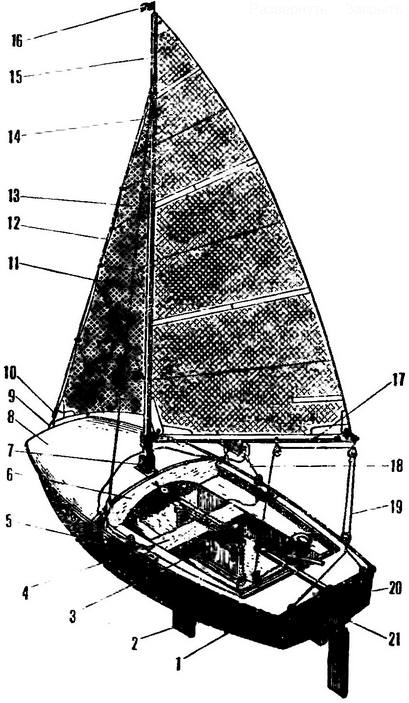 Конструктивно мини-швертботы также очень схожи. На рисунках 1 и 3 изображены два парусника. Первый предназначен для туризма, а второй - для небольших прогулок. Корпуса туристских судов должны обеспечивать удобное размещение в них экипажа и походного снаряжения, поэтому для них характерны большой кокпит (вырез в палубе) и рундуки для хранения имущества. Корпуса же прогулочных и спортивных швертботов обычно полностью закрыты палубой и имеют только небольшой кокпит для экипажа. В остальном они братья-близнецы. Проблема безопасного плавания на мини-швертботах сюит ничуть не менее остро, чем на самых больших судах. В данном случае она решается применением отсеков плавучести - воздушных ящиков или блоков пенопласта. Оборудованный таким образом парусник даже после опрокидывания легко поднимается на ровный киль. В ряде конструкций применяется второе дно, или, как его иначе называют, самоотливной кокпит. Дополнительное днище обычно располагается выше ватерлинии, поэтому после подъема судна на ровный киль вода уходит из трюма через сливные отверстия в транце (шпигаты). Непременной деталью любого швертбота (которая, в общем-то, и дала название парусным судам этого класса) является шверт. Он представляет собой металлическую или фанерную пластину, установленную под днищем судна и выполняющую очень важную работу по снижению дрейфа "под ветер" и продвижению судна "на ветер". Конструктивно шверты делают поворотными либо "кинжальными" Вторые проще, поскольку швертовый колодец для них занимает меньше места в кокпите, однако при попадании на мель такой шверт ломается или разрушает швертовый колодец. Поэтому туристские суда принято оборудовать поворотными швертами - при соприкосновении с подводным препятствием такой шверт просто поворачивается вокруг своей оси. Рулевые устройства мини-швертботов почти такие же, как и соответствующее оборудование полноразмерных яхт. Традиционно оно состоит из румпеля, балерной коробки и пера. Перо (так же, как и шверт) может быть неподвижным и поворотным. Румпель часто делают с удлинителем, что позволяет управлять парусником при откренивании. Парусное вооружение отличается большим разнообразием. Широко используется бермудское вооружение (рис. 1), но наряду с ним встречаются и вооружения типа гуари, гафельное, рейковое и латинское (рис. 3, см. также "М-К" № 6, 1977 г.). Популярность бермудского вооружения объясняется его высокими аэродинамическими качествами. При равной площади с парусами других типов (рис. 2) бермудский обеспечивает судну наибольшую скорость.