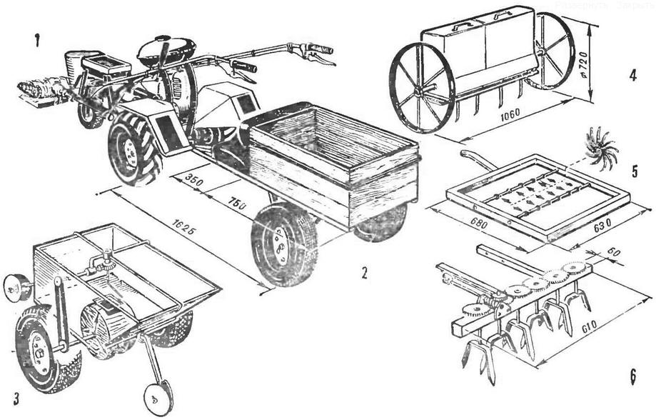 Рис 1. Универсальная сельскохозяйственная машина УСММ-2 "Золушка" (базовая модель) с комплектом прицепных и навесных приспособлений (нажмите для увеличения): 1 - роторная косилка, 2 - транспортная тележка, 3 - агрегат для высадки картофеля, 4 - зерновая сеялка, 5 - механическая мотыга-рыхлитель, 6 - рыхлитель с вращающимися ножами
