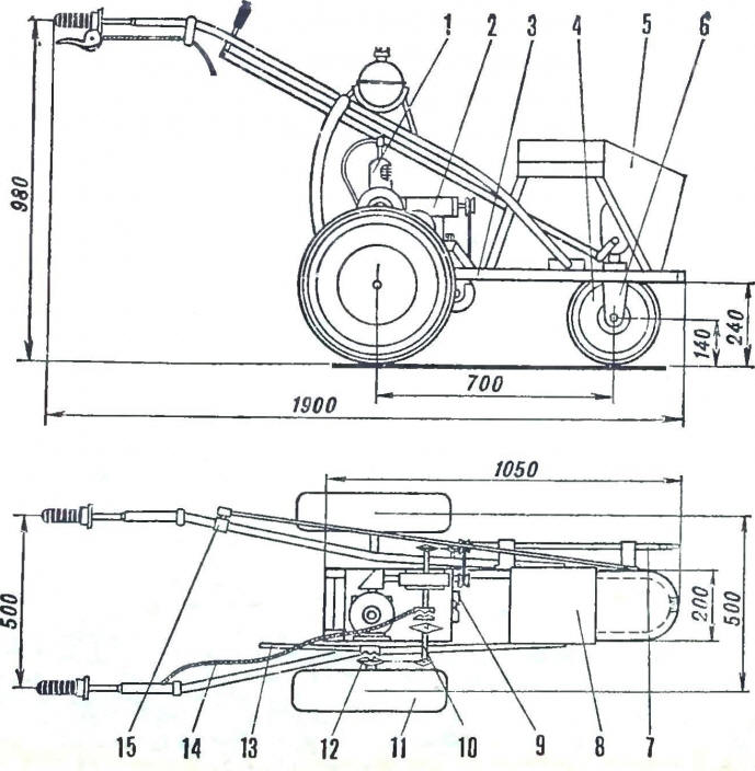 Рис. 2. Компоновка "Золушки" в трехколесном варианте: 1 - двигатель от бензопилы "Дружба", 2 - червячный редуктор, 3 - рама, 4 - переднее колесо, 5 - кожух колеса, 6 - вилка, 7 - вал отбора мощности, 8 - инструментальный ящик, 9 - кулачок, 10 - промежуточный вал, 11 - ведущее колесо, 12 - муфта сцепления, 13 - раздвижная рукоятка, 14 - трос управления, 15 - рулевой рычаг (на плановой проекции топливный бак условно не показан)