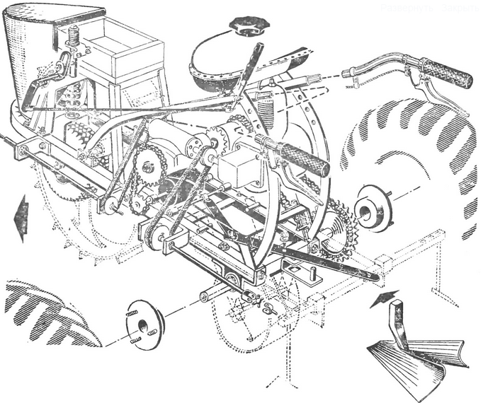 Рис. 3. Агрегат для прореживания свеклы (для одноколесного) варианта "Золушки") (нажмите для увеличения)