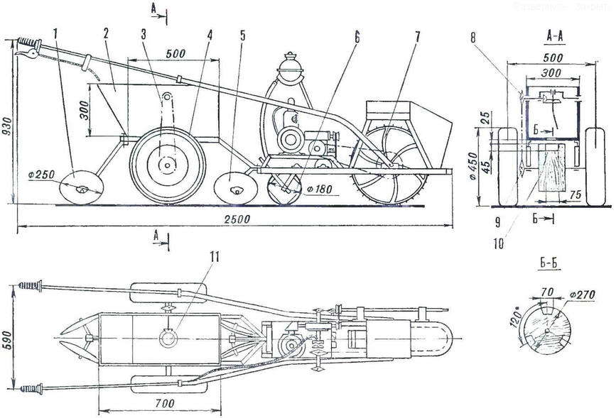 Рис. 6. "Золушка" (одноколесный вариант) с агрегатом для высадки картофеля (нажмите для увеличения): 1 - заделывающий агрегат, 2 - бункер, 3 - цепь ворошителя, 4 - колесо сеялки, 5 - плуг, 6 - колесо регулятора заглубления, 7 - ведущее колесо, 8 - звездочка привода ворошителя, 9 - ведущая звездочка привода ворошителя, 10 - высаживающий ротор, 11 - редуктор ворошителя