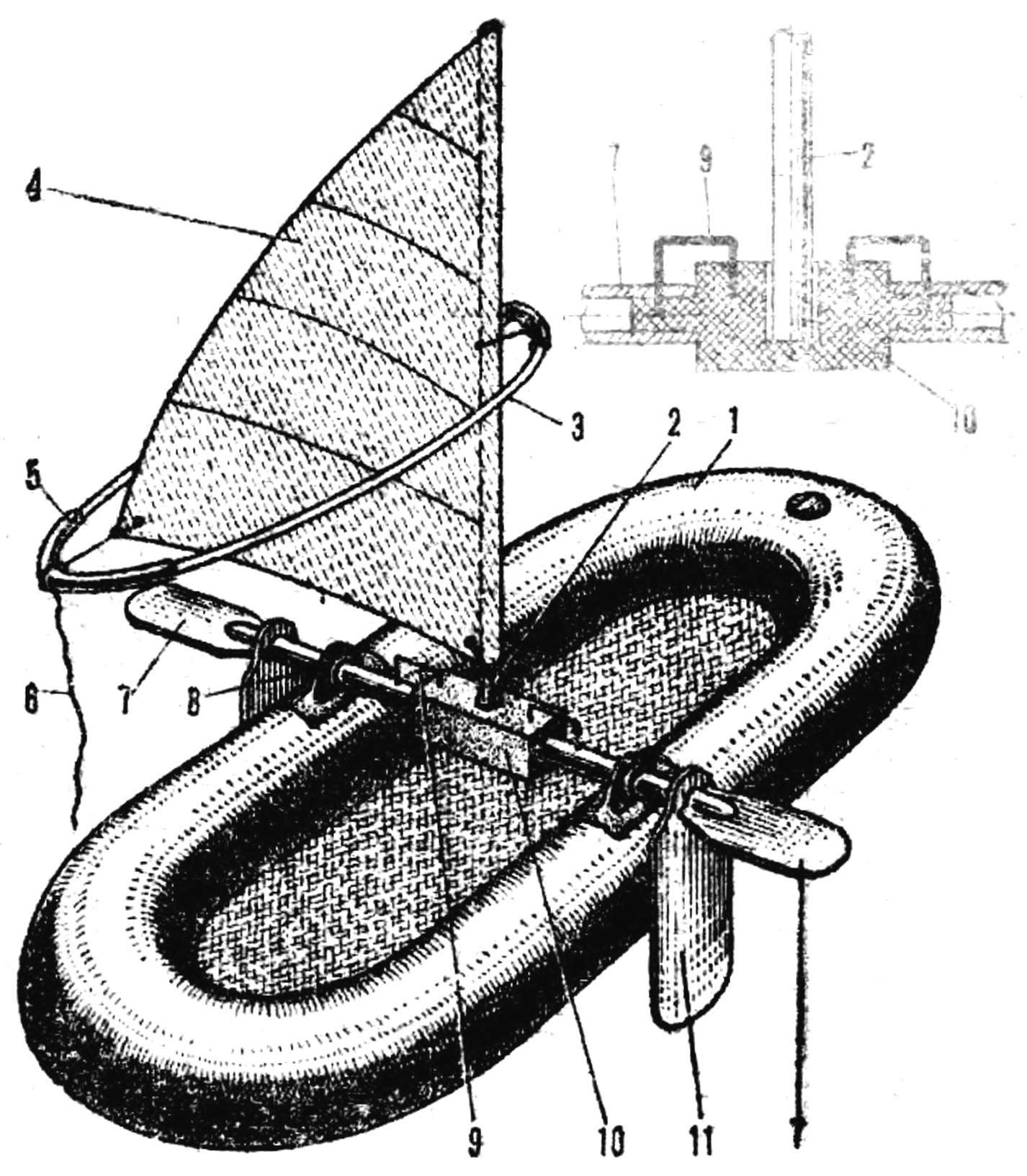 И надувная и парусная (нажмите для увеличения): 1 - резиновая лодка, 2 - мачта, 3 - гик, 4 - парус, 5 - шланг - соединитель гика, 6 - гика-шкот, 7 - весло, 8 - резиновые уключины, 9 - соединительные скобы (Д16, Ø 7 мм), 10 - степс, 11 - шверц