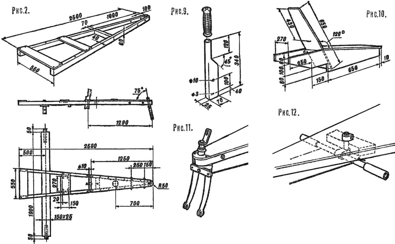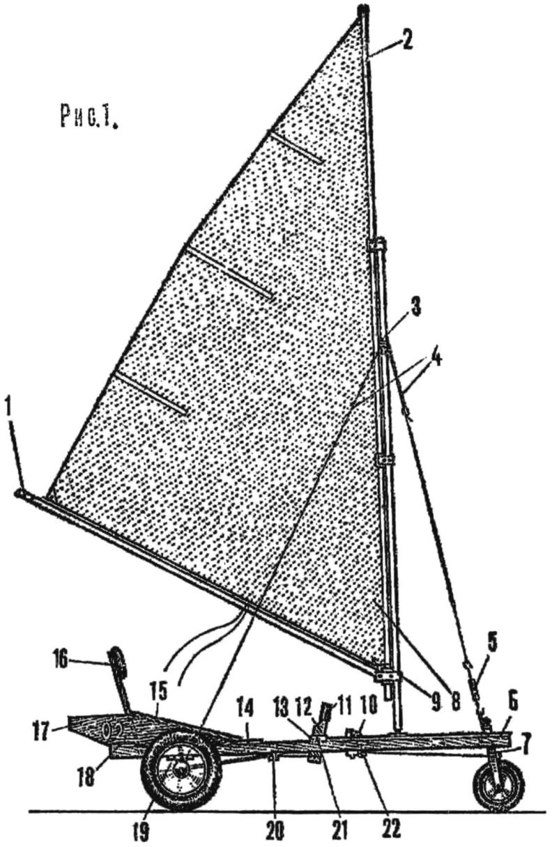 Cухопутный парусник. Личный транспорт Справочник / Личный транспорт: наземный, водный, воздушный Колесный буер, пляжный парусник, песчаная яхта, ветромобиль... Все эти термины относятся к одному и тому же тину транспортных средств, использующих для движения силу ветра. Конструкций таких "ветроходов" - великое множество, из года в год разрабатываются все новые - на трех колесах и на четырех, с латинским парусом и с бермудским вооружением, с жесткими плоскостями, напоминающими самолетное крыло, и даже с горизонтально расположенной вертушкой, подобной крыльчатке анемометра. Предлагаем вашему вниманию песчаную яхту наиболее распространенной на сегодня схемы - с вооружением тина "бермудский кэт" и трехколесной тележкой, переднее колесо которой служит рулевым. Несмотря на сравнительно небольшие размеры, этот своеобразный парусный карт может развивать скорость до 50 км/ч! Сделайте со своими друзьями несколько таких "машин", и вы сможете устраивать самые настоящие гонки, разумеется, в местностях, где есть достаточно ровные поля и дуют постоянные и сильные ветры. Впрочем, кататься на этом паруснике можно и на школьном стадионе или даже по проселку. Основой тележки парусника служат два сосновых лонжерона сечением 40х60 мм каждый. Бруски собираются с помощью поперечины сечением 60х70 мм в виде буквы А. Дополнительно рама подкрепляется в передней части фанерной косынкой S10 и в средней и задней частях двумя полосами из той же фанеры шириной 150 км. Все элементы рамы стыкуются на эпоксидном клее и болтах М6. Для заднего моста вам потребуется сосновая или еловая доска сечением 25х150 мм и длиной 1900 мм. К выбору материала подойдите повнимательнее. Поскольку балка моста служит к тому же и поперечной рессорой - доска должна быть прямослойной, желательно без сучков и расслоений. С лонжеронами рамы балка стыкуется с помощью 8-мм болтов или шпилек и эпоксидного клея. Переднее поворотное колесо (дутик от датского велосипеда) закрепляется в велосипедной вилке. Она поворачивается во втулке - передней части того же велосипеда, вырезанной из старой рамы вместе с отрезком горизонтальной трубы. Втулка зажимается между лонжеронами, а ее горизонтальная труба приворачивается к фанерной косынке рамы 6-мм болтами. Пляжным парусником управляют с помощью педалей, связанных штуртросами с металлической пластиной толщиной 5 мм, привернутой к передней части вилки.