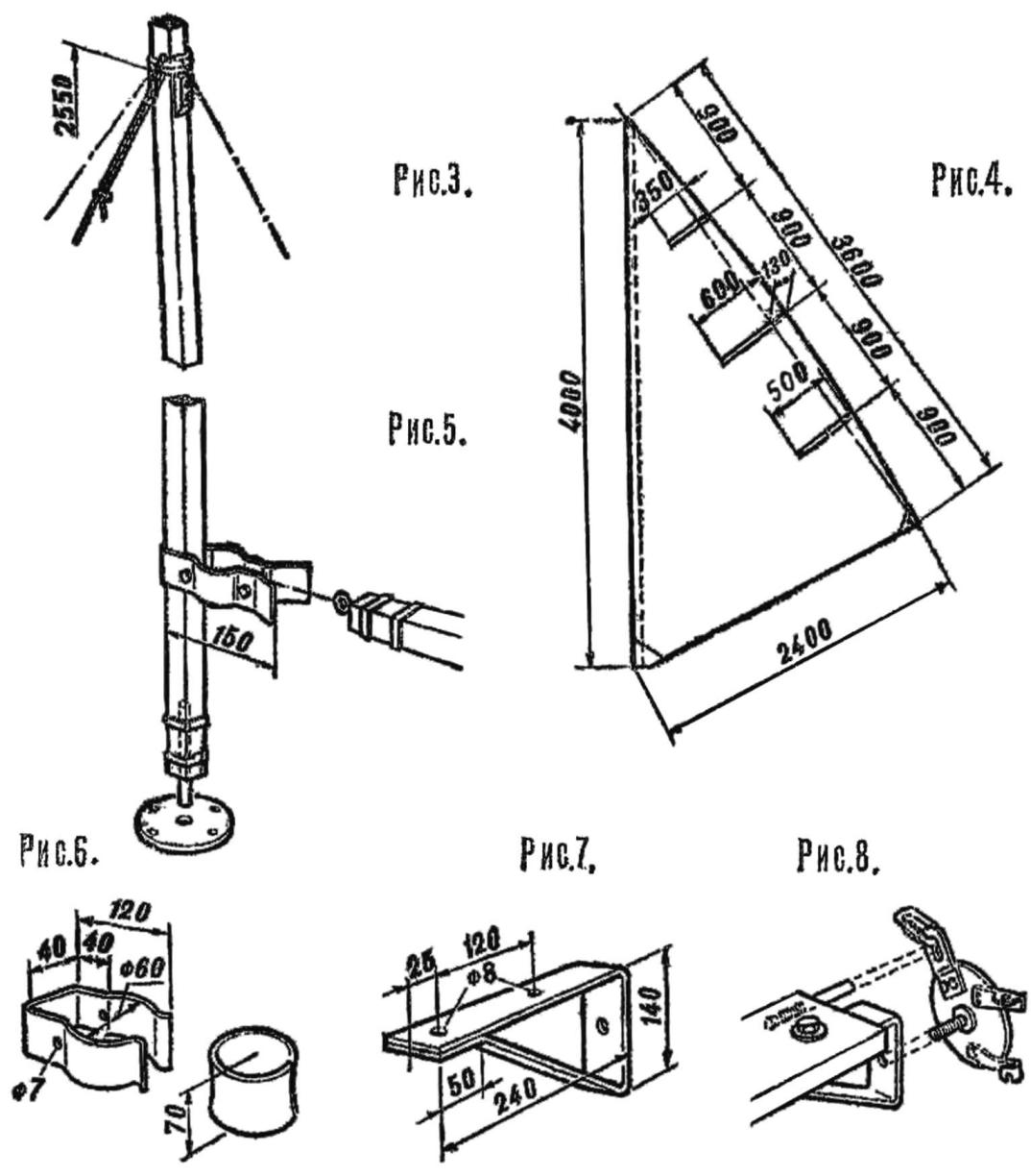 Задние колеса - от мопеда "Верховина" или "Рига-16" - навешиваются на кронштейны, выгнутые из стальной полосы сечением 4X60 мм. К балке заднего моста кронштейны крепятся двумя 8-мм болтами каждый. Фиксация тормозного барабана - стальной шпилькой, ввернутой в балку. Оси колес закрепляются в кронштейне двумя гайками с шайбами с последующей контровкой мягкой проволокой. Педали, связанные с рулевым колесом, располагаются на поперечине рамы. Проще всего сделать их из велосипедного руля, втулки и хомутика, которым на велосипеде закрепляется руль. Тормозной рычаг вырезается из деревянного бруска сечением 25х70 мм. На его верхнюю часть надевается рукоятка от велосипедного руля. Отверстия (под ось и коуш троса) желательно усилить металлическими втулками - отрезками труб. Тросы в боуденовской оболочке проложены от тормозных барабанов задних колес до двух стальных профилей "уголок", закрепленных болтами на раме в районе средней фанерной поперечины. Далее через уравнитель натяжения тросов - к тормозному рычагу. Сиденье собирается из фанеры S10 в соответствии с рисунком. Стыковка отдельных деталей - на дюралюминиевых уголках и винтах М4. В верхней части спинки установите подголовник - поролоновую губку, обшитую искусственной кожей. Конструкция мачты целиком зависит от ваших возможностей; лучше всего использовать дюралюминиевую трубу диаметром около 40 мм - для это, о вполне подойдет прыжковый шест. Хорошая мачта получится и из дерева, особенно если собрать ее из нескольких реете па эпоксидном клее. Мачта расчаливается штагом и вантами. Для них подойдет стальная проволока Ø 1,5 мм либо стальной трос Ø 2 мм. Для регулировки натяжения такелажа используйте винтовые талрепы. Площадь паруса - около 4 м2. Сшить его можно из плотной непродуваемой ткани - например, подушечного тика, палаточной ткани или болоньи. Полотнища располагаются параллельно нижней шкаторине паруса, и сшиваются между собой швом "зигзаг". Задняя и нижняя шкаторины обшиваются лентой, вырезанной из того же материала. К передней шкаторине пришивается мачтовый карман - такой же, как на парусе виндсерфера (парусной доски). Первые испытания сухопутного парусника лучше всего проводить при уморенном ветре. Прежде всего проверьте надежность тормозов и работу рулевого управления. Затем сориентируйте парусник так, чтобы направление ветра было перпендикулярным выбранному курсу ("галфвинд"). Выбирайте распущенный шкот до тех нор, пока парус перестанет заполаскивать, после этого разгоняйте яхту, пока не почувствуете, что она движется без вашей помощи. На ходу забирайтесь на сиденье и выбирайте шкот - к этому времени парус, как правило, начинает заполаскивать. Работая шкотами, все время держите парус на грани заполаскивания его передней шкаторины - в этом случае его тяга будет максимальной.