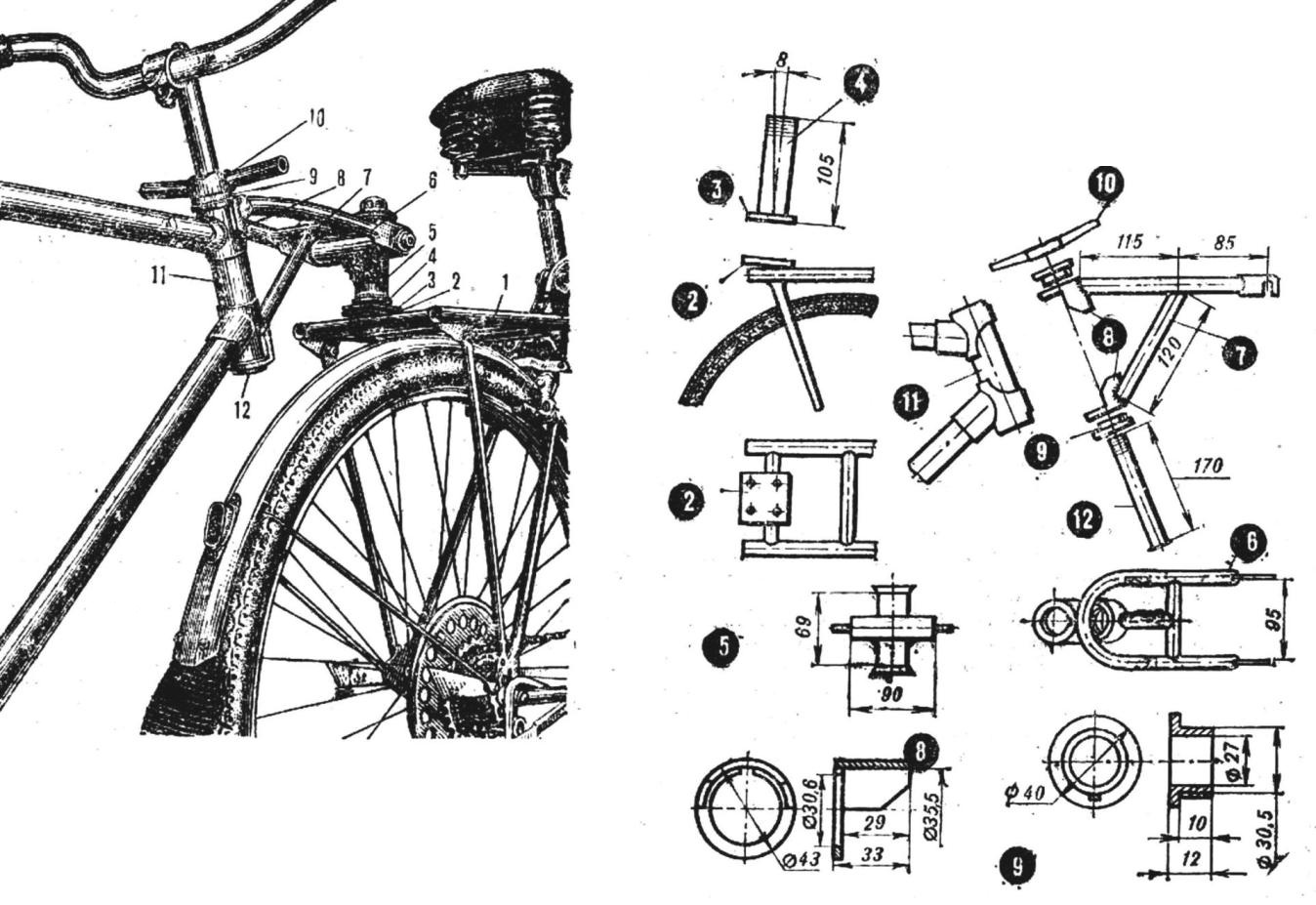 Ê áàãàæíèêó ïåðâîãî âåëîñèïåäà ïðèâàðèâàåòñÿ ïÿòà ñ îòâåðñòèÿìè ïîä âèíòû Ì4: ñþäà áóäåò êðåïèòüñÿ îñíîâàíèå øêâîðíÿ. À ñàì îí èçãîòàâëèâàåòñÿ èç ñòåðæíÿ ïåðåäíåé âèëêè (ïîäáèðàåòñÿ èç ñòàðûõ èëè çàïàñíûõ). Ñíèçó ê øêâîðíþ ïðèâàðèâàåòñÿ îñíîâàíèå, à ñâåðõó íà íåãî íàäåâàåòñÿ êðåñòîîáðàçíàÿ âòóëêà-øàðíèð.  êà÷åñòâå âåðòèêàëüíîé ÷àñòè ìîæåò áûòü èñïîëüçîâàí îòðåçîê ðóëåâîé âòóëêè ñòàðîãî âåëîñèïåäà èëè çàãîòîâêà èç äþéìîâîé òðóáû: åå òîðöû ïðîòà÷èâàþòñÿ ïîä ÷àøêè ïîäøèïíèêîâ îò ðóëåâîé âòóëêè. Êðåñòîâèííàÿ (ãîðèçîíòàëüíàÿ) ÷àñòü èçãîòàâëèâàåòñÿ èç òðîéêè Ø 28 ìì.  íåå âñòàâëÿåòñÿ îñü ñ ïîäøèïíèêàìè îò ñòàðîãî ïåðåäíåãî êîëåñà. Òàêèì îáðàçîì, êðåñòîîáðàçíûé øàðíèð áóäåò îáåñïå÷èâàòü äâå ñòåïåíè ñâîáîäû: ïîâîðîòû âîêðóã âåðòèêàëüíîé è ãîðèçîíòàëüíîé îñåé.