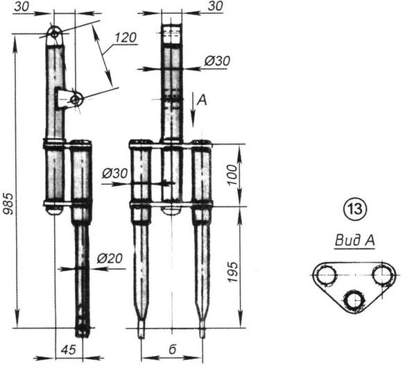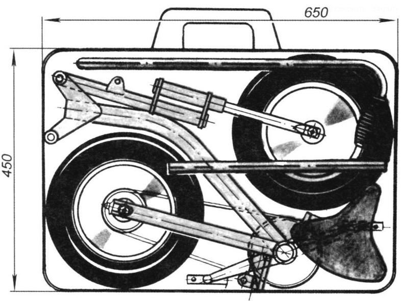 Велосипед в чемодане. Личный транспорт Справочник / Личный транспорт: наземный, водный, воздушный Складным велосипедом сегодня никого не удивишь. Однако его габариты даже в сложенном виде не так уж и малы, и хранить его дома, а тем более транспортировать в автобусе или трамвае не всегда удобно. Я поставил целью разработать удобный складной велосипед минимально возможных в сложенном положении габаритов. Хотелось, чтобы он легко трансформировался в чемодан размером с привычный "дипломат". Скажу сразу, этого достичь не удалось, а вот сконструировать двухколесную машину, которая после трансформации помещается в чемодане или сумке с габаритами 650x450x150 мм, я все же сделал. Изделие имеет колеса-дутики от детского велосипеда (или самоката) с шинами, имеющими обозначение 250x56. В случае, если у вас окажутся другие колеса, придется внести изменения в конструкцию складного велосипеда. Рама велосипеда - хребтового типа, она согнута из трубы с внешним диаметром 40 мм и толщиной стенки 2-2,5 мм. Спереди рамы располагается шарнирно-стыковочный узел, состоящий из двух фигурных трехмиллиметровых стальных пластин. К раме пластины прикрепляются сваркой. Отверстия под шарнир и болт-фиксатор сверлятся в пластинах и разделываются после сварки. С противоположной стороны хребтовой трубы приваривается подшипниковый узел ведущей звездочки - корпус каретки. Делать его самому совсем не обязательно - подойдет каретка практически от любого велосипеда. Около каретки к раме приваривается фиксирующее устройство, с помощью которого задняя вилка надежно стыкуется с рамой. Замечу, что этот узел лучше всего монтировать "по месту" в процессе сборки велосипеда. Это позволит достичь того, что ответные части - и та, что на раме, и та, что на задней вилке, - четко совпадут при складывании велосипеда. Как это делается, расскажу позже, когда пойдет речь о сборке двухколесной шины. Передняя вилка по конструкции напоминает развернутую на 180° вилку мопеда. Она состоит из неподвижной и поворотной частей. Поворотная часть сварена из велосипедной рулевой колонки (отрезается от рамы старого велосипеда) и двух перьев, каждое из которых сварено из двух труб, телескопически входящих друг в друга. Внешний диаметр большей трубы - около 30 мм, толщина стенки - 2 мм, диаметр внутренней - около 20 мм, толщина стенки - 2 - 2,5 мм. Концы перьев расплющиваются, и в них засверливаются отверстия в соответствии с диаметром оси колеса велосипеда. Рулевая колонка сваривается с перьями при помощи двух мостиков -пластин из листа толщиной около 3 мм с просверленными в них отверстиями под колонку и перья. Неподвижная часть передней вилки - это стальная труба, внешний диаметр которой такой же, как у вваренной в поворотную часть вилки велосипедной рулевой колонки. В последнюю вставлена и закреплена сваркой еще одна труба - такого диаметра, чтобы на нее насаживались подшипники велосипедной рулевой колонки. На неподвижной части передней вилки закрепляется и узел поворота, относительно которого складывается передняя часть велосипеда, а также "ухо" под болт-фиксатор, удерживающий переднюю вилку в рабочем положении.