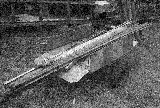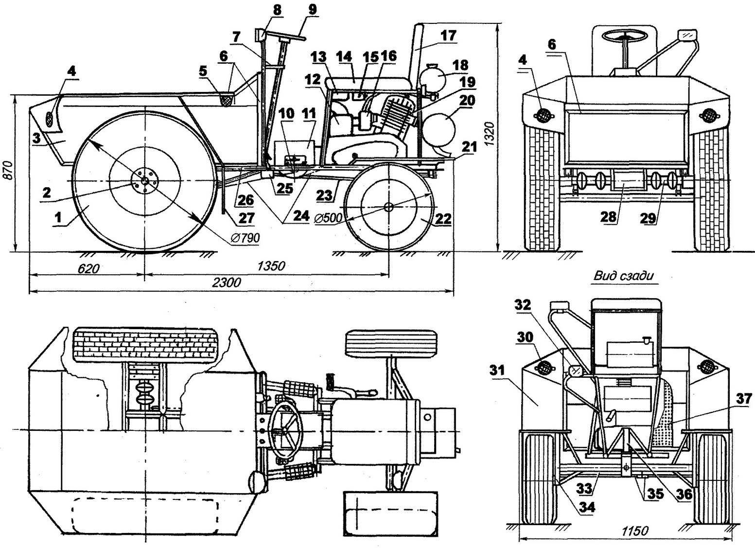 Кузов трактора - сварной. Его каркас выполнен из различных уголков и обшит листовой сталью толщиной 1,5 мм. Все углы по верху кузова закруглены для исключения травмирования. Примерно на 1/3 длины кузова от переднего борта снизу к поперечному уголку каркаса приварены две втулки, с помощью которых через шкворни он подвешивается к проушинам, приваренным к первой поперечине рамы трактора. Крылья передних ведущих колес приварены непосредственно к кузову, имеют несколько функций - расширяют погрузочную площадь, служат защитой от брызг и увеличивают жесткость самого кузова, так как на тракторе иногда приходится перевозить значительные по массе грузы. Для транспортировки сыпучих материалов большую часть объема размещаю на передней части кузова, что позволяет его легко опрокидывать вперед почти вертикально без дополнительных устройств. Наклонный передний борт и установленные с наклоном вовнутрь крылья способствуют разгрузке материалов почти без остатка, особенно если дать трактору задний ход. Электрооборудование штатное шестивольтовое. Штатные также и карбюратор, и воздухоочиститель. Тумблер включения зажигания одновременно подключает и аккумулятор. Здесь же на щитке расположен тумблер включения фары и заднего фонаря. На нем же установлены и контрольные лампы "нейтрали" и работы генератора. Также повышают безопасность и светоотражатели, установленные на кузове. Органы управления включают в себя педали: "газа", тормоза и сцепления. Следует отметить, что педаль "газа" дополнительно подпружинена: это необходимо для более точного управления оборотами двигателя в условиях загрязнения и при движении по бездорожью. На щитке перед рулевым колесом установлен рычаг управления реверсом. Через две жесткие тяги и промежуточный Г-образный рычаг, установленный над рулевым механизмом, производится переключение реверс-редуктора. Сам рычаг на реверсе подпружинен для лучшей фиксации его в крайних положениях в условиях тряски. Ручная лебедка подъема и опускания отвала представляет собой валик с небольшим барабаном со щеками, препятствующими сходу троса. Валик вращается в стакане с подшипниками, стакан приварен к "фарному" кронштейну. Ручка управления лебедки прижимается пластинчатой пружиной к зубчатому колесу, приваренному к стакану-ступице валика, и служит для стопорения ручки с помощью зуба, входящего во впадины зубчатки (сама зубчатка - от детского велосипеда). Трос наматывается на барабан лебедки через ролик, установленный внизу у края кузова и далее через такой же ролик, находящийся на первой поперечине рамы трактора, тянет за поперечину рамы отвала. Отвал подвешивается к раме трактора в двух кронштейнах-ушках висячих стоек. Для этого на концах подвесных упоров отвала имеются втулки, которые вставляются в проушины кронштейнов и крепятся здесь шкворнями со шплинтовкой. Сам отвал прост, хочу только отметить, что увеличение его массы нежелательно - это приводит к увеличению усилий на ручке его подъема. По этой причине подвесные упоры с поперечинами, составляющие рамку отвала, выполнены из тонкостенных труб за исключением нижнего уголка основной поперечины, а щит изготовлен из дюралюминия. По низу отвала крепятся съемные резиновые полосы, они имеют выпуск снизу на 30 - 40 мм для смягчения ударов о кочки. В верхнем положении отвал п