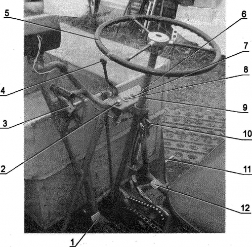 К балке заднего моста, правее середины, приварен стакан, в котором на подшипниках смонтирован Г-образный рычаг, один конец которого приводится в действие продольной тягой от рейки рулевого механизма, а другой конец двигает две поперечные рулевые тяги соответствующих колес. Ввиду большого хода балки при движении трактора по сложным участкам пути, диаметр задних колес не может быть увеличен без увеличения ширины заднего моста из-за упора брызговиков в двигатель при крайних положениях.