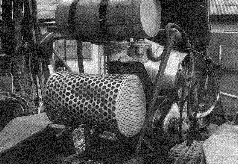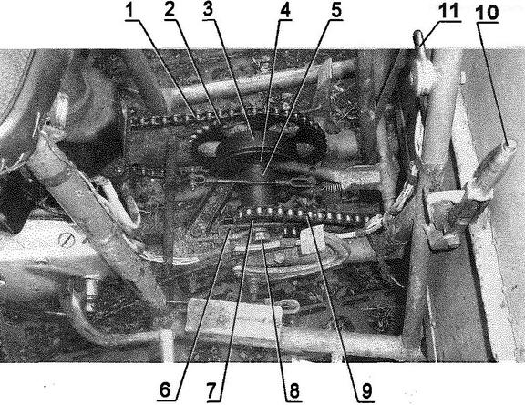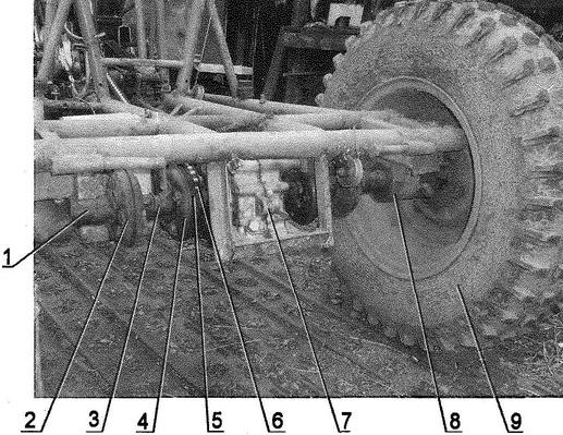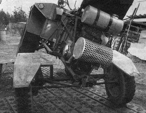 Эксплуатация показала, что декомпрессор теперь двигателю не нужен, достаточно следить за чистотой и исправностью топливной системы и карбюратора. Отказы двигателя из-за отсутствия искры в запальной свече практически исчезли, что раньше было обычным делом. Изменено также крепление платы прерывателя - теперь она посажена на вал генератора по скользящей посадке и может поворачиваться на некоторый угол, тем самым регулируя зажигание. Плата прерывателя крепится к статору генератора с помощью удлиненных винтов, которые после фиксируются с помощью припаянных к ним скобок из проволоки. Владельцам одноцилиндровых "ижей" хорошо знакомы обратные удары рычага кикстартера, что иногда приводит к серьезной травме. Данная переделка полностью исключает это неприятное явление. Перед запуском двигателя плата с помощью рычажка, выведенного сквозь кожух генератора, переводится на "позднее" зажигание, а после прогрева двигателя возвращается на место. На рычажке, в месте выхода его из крышки генератора, имеется стопорный флажок, который своим выступом попадает в паз на крышке, тем самым обеспечивая устойчивое положение рычажка платы на нужном угле зажигания. Для точной настройки момента разрыва контактов прерывателя флажок сделан подвижным. По такому принципу переделаны все одноцилиндровые двигатели "ижей", мною применяемые. Глушитель использован от снегохода "Буран", он компактен и достаточно эффективен. К штатным входным патрубкам глушителя приварены обрезки выхлопных труб с накидными гайками от "Иж-ПЗ". Поскольку двигатель расположен в задней части рамы шасси, а ведущие колеса - передние, то передачу вращающего момента от силового агрегата к главной передаче пришлось осуществить через двухступенчатую цепную передачу с промежуточным редуктором. Цепи уширенные, комбайновые. От комбайна и большая (Z = 53 зуба) звездочка на одном конце промежуточного вала. На другом конце вала установлена звездочка Z = 15 от заднего колеса мотоцикла "Иж". Кроме этого на промежуточном валу смонтирован тормозной барабан (приварен к мотоциклетной звездочке) от колеса мотороллера "Вятка". Крышка тормоза самодельная, а колодки - штатные мотороллерные. Щит к раме крепится через два кронштейна в виде лап. При этом предусмотрена возможность ориентировки (небольшого перемещения и поворота) щита с колодками относительно барабана. Сам промежуточный редуктор тоже можно перемещать вдоль лонжеронов рамы для натяжения цепи, идущей к главной передаче. Главная передача (или реверс-редуктор) использована от грузового мотороллера "Муравей". Она подвергнута модернизации: вместо штатных узких шестерен дифференциала и заднего хода установлены уширенные от инвалидной коляски СЗД. Конечно, если строго следить каждый раз за массой груза и не злоупотреблять тяговыми усилиями силового агрегата (а он, кстати, способен и на большие нагрузки), то этих переделок реверс-редуктора и не требуется. Приводная звездочка главной передачи (она же ведомая звездочка второй ступени цепной передачи) тоже взята от инвалидной коляски. В принципе, реверс-редуктор можно использовать и от коляски СЗД. Однако у него паразитная шестерня заднего хода установлена на валу на подшипнике скольжения (бронзовой втулке). При интенсивном использовании заднего хода' (что при приусадебной эксплуатации тракт