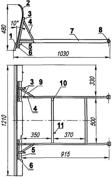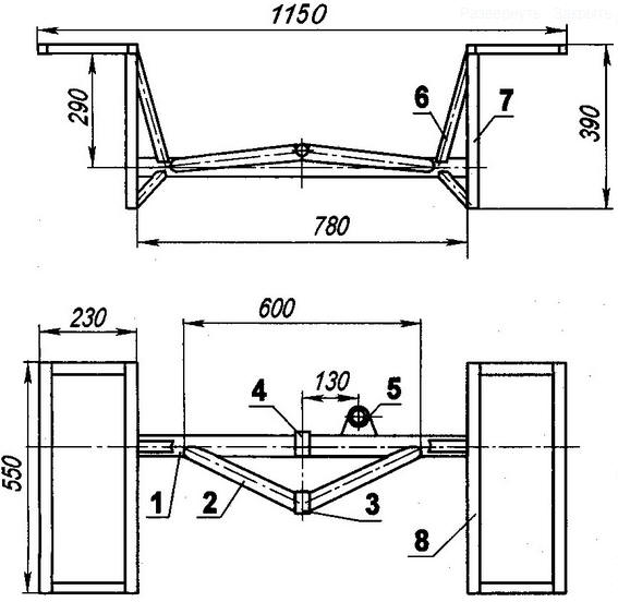 Приусадебный грузовичок. Личный транспорт Справочник / Личный транспорт: наземный, водный, воздушный Я являюсь давним читателем и постоянным подписчиком журнала "Моделист-конструктор". На протяжении почти сорока лет не только знакомился с машинами и механизмами конструкторов-любителей, но и создавал свои. Поэтому могу и себя причислить к когорте "самоделкиных" со стажем. Строил же в основном землеобрабатывающую и транспортную технику (от мотоблоков до джипов). Что-то из созданного ранее разобрал или переделал, какие-то продал, а отдельные эксплуатирую до сих пор, например, мини-трактор (а точнее - самоходное шасси), конструкцию которого и представляю на суд читателей. Шасси предназначено для перевозки различных грузов для приусадебного хозяйства (как в собственном кузове, так и в буксируемом прицепе), а зимой - еще и для уборки снега с помощью навешиваемого спереди бульдозерного отвала. Описание конструкции начну с рамы. Она сварена в основном из стальных водопроводных труб круглого сечения. В плане (вид сверху) рама имеет форму вытянутой трапеции с большим основанием впереди. Основу рамы составляют два прямых параллельных лонжерона, выполненных из трубы наружным диаметром 42 мм и толщиной стенки 3 мм. Из такой же трубы изготовлена и пара передних поперечин: первая - сплошная, а вторая - из трех частей. Сзади лонжероны соединены тремя короткими поперечинами. Остальные детали рамы выполнены из более тонкой трубы - наружным диаметром 32 мм и толщиной стенки 2,5 мм. Вспомогательные же элементы (стойки, распорки, подкосы и прочее) - из круглых труб 22x2 мм. Различные кронштейны для монтажа агрегатов и узлов изготовлены из подходящего сортового проката. В большинстве своем они приваривались к раме "по месту" во время компоновки агрегатов и механизмов конструкции, а потому на чертеже рамы не показаны.