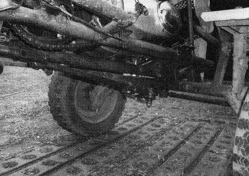 Между передними поперечинами на концах приварено по два кронштейна, выполненных из П-образного профиля 50x25x50 мм. К ним крепятся болтами ступицы передних ведущих колес. К лонжеронам приварены ребра (из уголка 25x25) ящика-каркаса для установки редуктора главной передачи. К задним поперечинам приварены кронштейны П-образного профиля для подвески заднего моста, а к замыкающей кронштейны, позволяющие с помощью поперечине сзади - еще два ушка, образующих форкоп. Сверху на раме (примерно в середине ее длины) закреплена сваркой рулевая стойка с кронштейном для фары, а в задней части - ножки и рамки сиденья и его спинки. Верхняя (горизонтальная) часть рулевой стойки - перемычка выполнена из широкого швеллера - она служит приборной панелью. Еще снизу в передней части приварены висячие отвальные стойки с проушинами (подкрепленные подкосами), к которым подвешивается бульдозерный отвал.