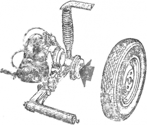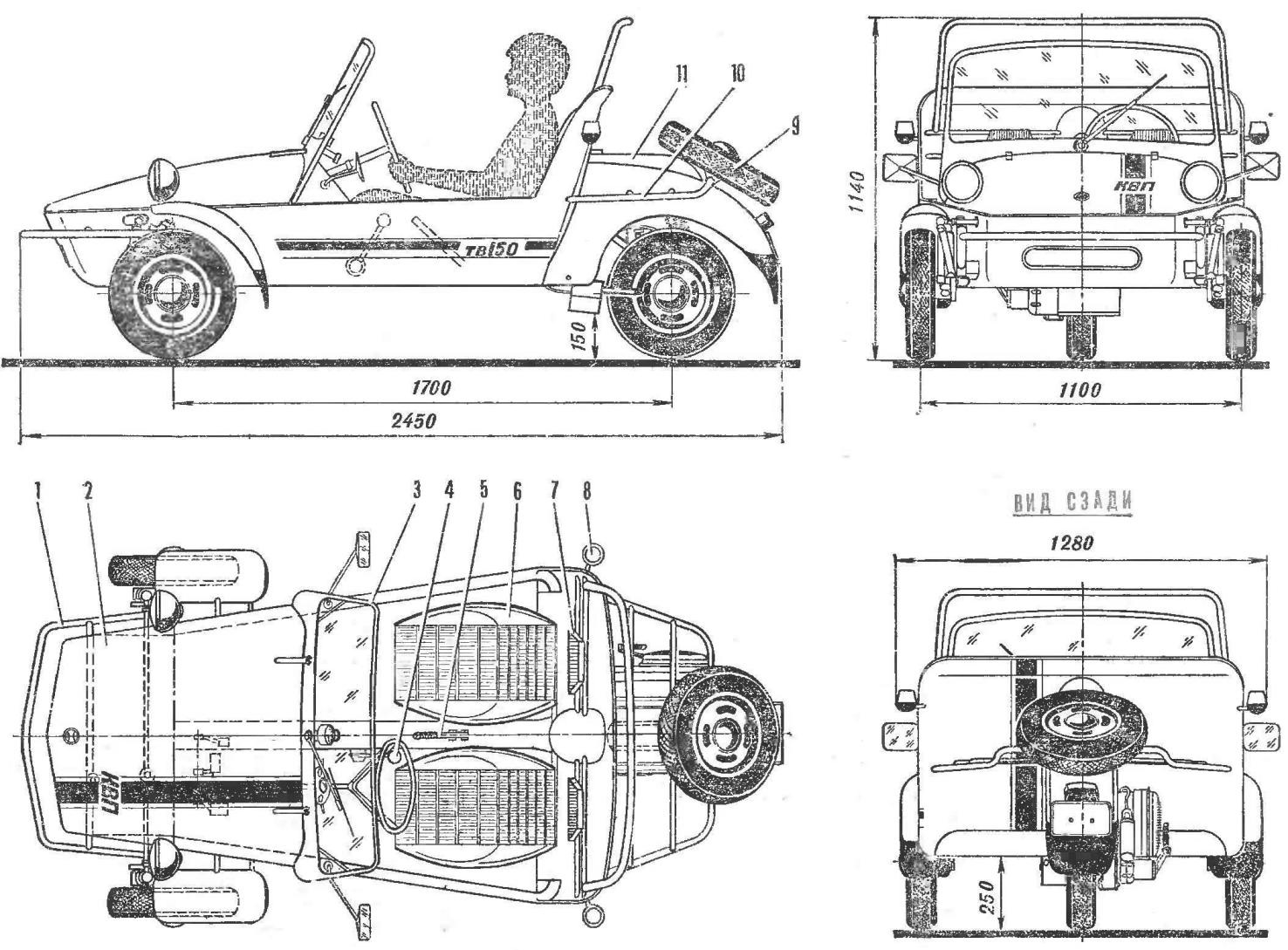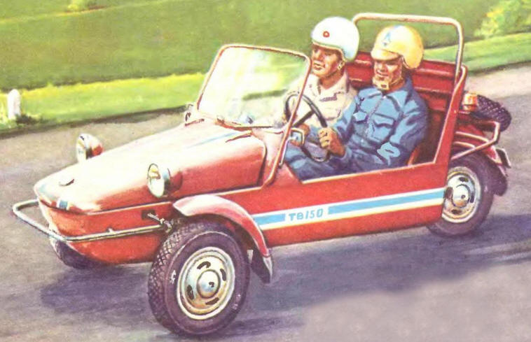 В передней части машины, под капотом, расположены выпрямитель от "Вятки" и аккумулятор. Здесь же находится багажник. Автомобиль снабжен стеклоочистителем, приводимым как от переднего колеса (привод сблокирован с приводом спидометра), так и вручную. Декоративные колпаки на колегах - от мотоколяски выполнены кольцевыми прорезями, что, на наш взгляд, делает колеса более динамичными. Микроавтомобиль оснащен и запасным колесом, расположенным на раме заднего багажника. Окраска: ярко-красный кузов с черно-белыми полосами и индексами; сиденья - красная основа, обивка - черная, подголовники - красные; кузов внутри - черный; диски колес - светло-серые, колпачки - ярко-желтые с черными ободками. Обрамление лобового стекла и задняя дуга безопасности выполнены с таким расчетом, что на микроавтомобиле могут быть установлены легкосъемный тент и две легкие дверки из брезента или кожзаменителя. В этом случае повышается комфортабельность машины, она становится всепогодной. Двигатель ВП-150, установленный на микроавтомобиле, развивает мощность 6 л. с. и позволяет машине идти со скоростью до 75 км/ч. Привод тормозов - механический, на все три колеса. Предусмотрен также стояночный тормоз - на заднее колесо. "Краб" успешно прошел всесторонние и длительные испытания, хорошо зарекомендовал себя. Автор: В.Тарануха