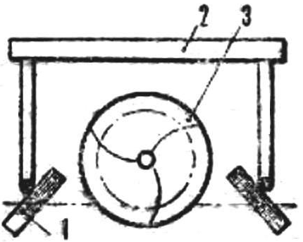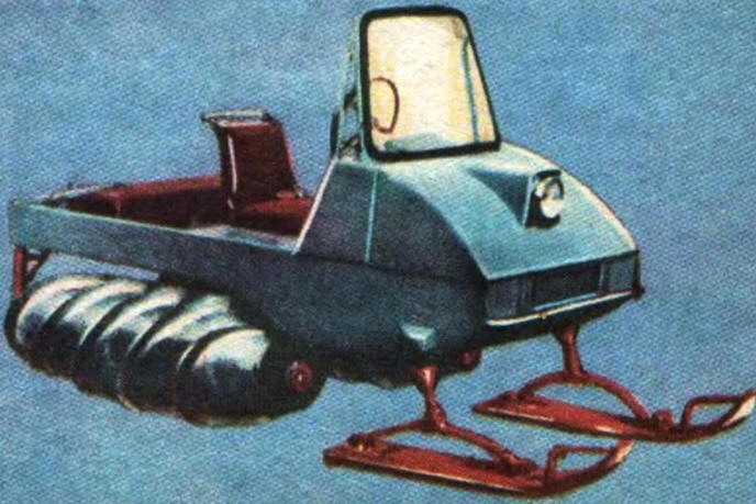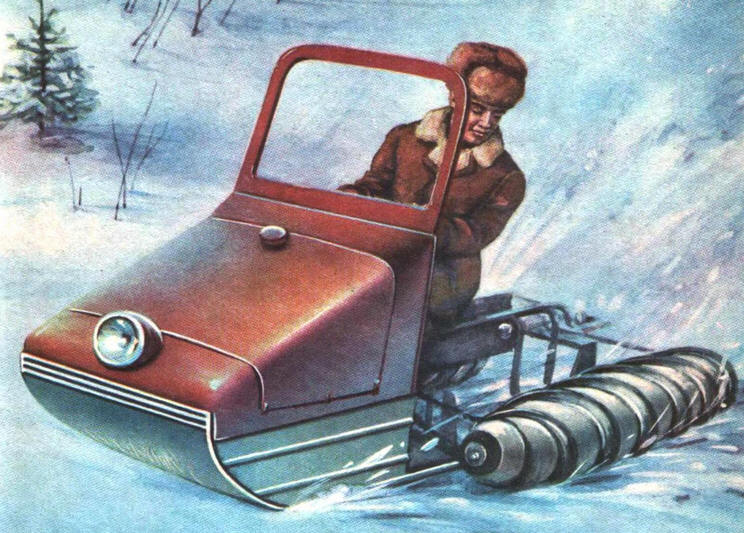 Шнеконарты КРАБ-1 состоят из лыжи-корпуса, одного шнека, моторной установки и одной передней управляемой лыжи, которая при движении уплотняет снег перед шнеком. Корпус имеет П-образную форму: боковые плоскости, снабженные подрезами, скользят по снегу, а в вырезе размещается шнек. Подрезы нейтрализуют боковые силы, возникающие на работающем шнеке, обеспечивая устойчивое прямолинейное движение машины. А сами плоскости-лыжи ограничивают пространство, в котором работает шнек, что значительно повышает его эффективность. Движитель закрепляется на раме, которая передней частью шарнирно кропится к силовым узлам П-образного выреза. Ее задняя часть не связана с корпусом-лыжей и выходит за его задний обрез. На ней с помощью специального кронштейна установлен двигатель Иж-56 с принудительным воздушным охлаждением, а также редуктор (реверс). Последний из/оговлен из заднего моста инвалидной мотоколяски. От редуктора на привод шнека идет цепная передача. Такая схема при движении позволяет раме шнека совместно с двигателем перемещаться в вертикальной плоскости, обеспечивая улучшение сцепления движителя с дорогой на неровностях. Этому же способствует оптимальная нагрузка шнека, несущего на себе вес двигателя и редуктора. Движитель, как и у всех подобных машин, представляет собой цилиндрический барабан Ø 320 мм и длиной 1500 мм с тремя спиралями зацепов, сдвинутых относительно друг друга на 120°. Шаг зацепов 450 мм - это означает, что за один оборот шнек продвигается вперед на 0,45 м. Трехзаходная спираль увеличивает сцепление со снегом, так как на расстоянии 1,5 м Длины шнека в зацеплении участвуют . одновременно 9 ребер. Для изготовления зацепов конструктор использовал отработавшие свой срок диски от муфты сцепления трактора. Передняя управляемая лыжа снабжена мягкой подвеской из рессоры, двух амортизаторов от мопеда "Рига" и ограничителей: резиновых подушек, предотвращающих жесткие удары и предохраняющих рессору от поломок. Даже столь краткий обзор шнекоходных машин показывает, что развитие этого специфического вида транспортной техники продолжается, как продолжаются и поиски новых конструктивных решений. Автор: И.Николаев