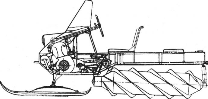 Почти одновременно появилась и еще одна разновидность шнековых машин. У них уже не было ни колес, ни лыж, а движители представляли собой цилиндры большого диаметра с трех-, четырехзаходной навивкой рабочего ребра. Управление осуществлялось как на гусеничных машинах: торможением одного из шнеков. Такая конструкция считается наиболее перспективной, поскольку дает возможность использовать подобные машины не только зимой, но и в условиях полного бездорожья. Здесь стоит упомянуть об испытаниях зимней техник", которые были организованы в Подмосковье в конце двадцатых годов. Проверялись возможности различных снегоходных машин, автомобилей, тракторов и приспособлений к ним, повышающих проходимость по снегу. В испытаниях участвовала техника, созданная институтом НАМИ, отдельными конструкторами. Были и зарубежные машины, среди них шнекоход "мотобоб" и трактор "фордзон" на червячных барабанах. Проведенное сравнение позволило выявить ряд преимуществ машин со шнековыми движителями: относительная простота, плавность хода, хорошее тяговое усилие. Но тогда же вскрылись и минусы, в основном заключавшиеся а небольшой скорости, плохой маневренности, недостаточной надежности конструкции. Немаловажным фактором явилась и ограниченность мест целесообразного использования шнекоходов по сравнению с гусеничными машинами и автомобилями повышенной проходимости. Все это послужило причиной ослабления внимания транспортных организаций к шнековому движителю. Возрождение интереса к машинам с "винтовыми" движителями как у нас в стране, так и за рубежом, приходится на 60-е годы. Оно связано с поиском вездеходных конструкций, применимых не только в ЗИМНИХ, но и в других особо тяжелых дорожных условиях. Различные экспериментальные шнекоходные машины, предназначенные специально для работы на сильно заболоченной местности, были созданы в США, Англии, Японии. В нашей стране большую исследовательскую работу, в том числе и по теории шнековых движителей, проделала лаборатория снегоходных машин Горьковского политехнического института имени А. А. Жданова. Под руководством кандидата технических наук, доцента С. В. Рукавишникова был разработан ряд легких шнековых машин (ГПИ-16Р, ГПИ-16ВА, ГПИ-16ВС и ГПИ-0,5), испытания которых подтвердили предположение о перспективности применения "роторно-винтовых" движителей для снегоходов и выявили ряд неоспоримых преимуществ этих движителей: более высокий КПД, повышенная долговечность и надежность, более высокие тягово-сцепные качества, меньший вес и простота конструкции.