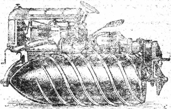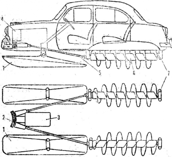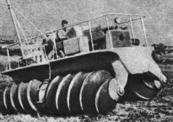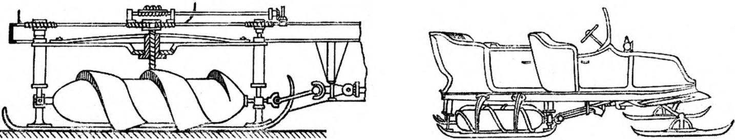 Эти машины имели винтовой движитель, установленный между задними колесами автомобиля. Шнек приводился во вращение от двигателя через специальную передачу. Первоначально на автомобили ставился один такой движитель, а позднее два параллельных. Что же представлял собой сам шнек! Внешне он напоминал винт в мясорубке: это определенного диаметра стержень, на который навито высокое спиральное ребро. Шнеки устанавливались на шарнирной подвеске, водитель машины, посредством системы рычагов мог опускать и поднимать их, то есть регулировать высоту по отношению к колесам автомобиля. Что это давало! При движении по глубокому, рыхлому снегу, например, достаточно было опустить шнек, чтобы он погружался в более плотный слой, обеспечивая лучшее сцепление. Позднее шнек начали ставить на пружинной подвеске - и та же операция выполнялась автоматически, упразднялась сложная рычажная система управления движителем. Но в первых вездеходах шнек все же работал недостаточно надежно, а сами машины имели слишком узкие колеса, которые под весом автомобиля глубоко погружались в снег и создавали большое сопротивление движению. Да и конструкция шнека была также несовершенна. Небольшого диаметра стержень и высокое узкое ребро его винтовой нарезки не уплотняли снег, а на твердом насте автомобиль мог перемещаться и без такого движителя. Следующий этап развития шнекового транспорта - увеличение диаметра винтового движителя, резкое уменьшение высоты спирального ребра и замена колес на лыжи. Эти усовершенствования резко повысили эффективность работы шнека. Теперь он превратился в цилиндр большого диаметра, который при перемещении хорошо уплотнял снег, а винтовое ребро, хотя и было меньшей высоты, работало значительно лучше. Испытания показали, что сцепление такого шнека с грунтом возрастает с увеличением приходящейся на него нагрузки. Это наблюдение привело к следующему этапу развития вездеходов рассматриваемого типа, который можно назвать современным, так как он захватывает и сегодняшний день. Конструкторы отказались от приспособления шнекового движителя к автомобилю, а стали строить специальные машины, в которых вся масса распределяется между двумя винтовыми движителями и передними управляемыми лыжами.