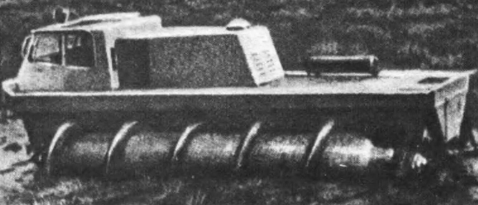 Мотоциклетный двигатель "Иж-Планета" снабжен принудительным охлаждением. При частоте вращения коленчатого вала 3200-3500 об/мин он развивает мощность 15,5 л. с. Силовая передача включает в себя цепные передачи на сцепление и коробку передач, выполненные в блоке с двигателем, от коробки передач - на редуктор, а также бортовые - с главного вала на конические редукторы привода движителей. На главный вал посажен тормозной диск. Ходовая часть состоит из двух управляемых лыж с амортизацией листовыми рессорами и двух винтовых барабанов движителя с их подвесками. Барабаны клепаные, негерметические, с зацепами из нержавеющей стали, число заходов навивки - 4. Шаг зацепов 1100 с углом по барабану 40°. Движители сзади подрессорены, что позволяет им иметь лучшее сцепление с грунтом для преодоления неровностей пути. Рулевое управление у шнекохода - с обычным рулевым колесом и механизмом реечного типа; соединение с поворотными рычагами пыж - тягами. Следует остановиться и на разработанных в Горьковском политехническом институте имени А. А. Жданова машинах особого назначения. В 1968 году вышли на испытания специальные вездеходы на шнековых движителях типа ГПН-63 и ГПИ-72, созданные под руководством профессора А. Ф. Николаева. Эти машины, имея высокую энерговооруженность, снабжены герметичными винтовыми барабанами большого диаметра, которые обеспечивают возможность свободного передвижения не только по снегу или заснеженному льду со скоростью до 20 км/ч, но даже по воде и непроходимым болотам. На них смонтированы ледово-фрезерные установки для окалывания льда вокруг зимующих судов в северных портах, для охраны от разрушения льдом гидротехнических сооружений. При толщине льда в 1,5 м скорость такой фрезерной проходки достигает 560 м/ч. Большой интерес представляет и машина ГПИ-92, сконструированная специально для механизации обработки илообразных осадков на площадках очистных сооружений больших городов. Такие отстойники имеют площадь до нескольких сот гектаров и должны при современных очистных мощностях поглощать в крупных городах до 16000 м3 илообразных осадков в сутки. Будучи обезвожены, эти массы могут быть использованы в промышленности и сельском хозяйстве. Но практика показала, что цикл обезвоживания затягивается на несколько лет, в основном из-за зарастания поверхности площадки сорными травами, которые препятствуют интенсивному испарению влаги. Машина ГПК-82 показала хорошую проходимость по иловым отстойникам при любой влажности, а роторно-винтовые движители к тому же интенсивно разрушают и погружают в их растительный покров без применения каких-либо дополнительных навесных орудий. Они перемешивают верхний слой на глубину 500-600 мм, что способствует более интенсивному испарению влаги. При мощности двигателя 115 л. с. и диаметре герметичных роторно-винтовых барабанов 800 мм машина обеспечивает скорость от 5 до 20 км/ч, в зависимости от степени влажности ила. Мощные машины на шнековых движителях быки созданы и на Московском автозаводе имени Лихачева. Шнекоход ШН-I снабжен двигателем в 180 л. с. и герметичными роторно-винтовыми барабанами с Ø 800 мм, с рабочим зацепом трапециевидной формы высотой 120 мм и углом наклона 17°. Для повышения жесткости на внутреннюю поверхность барабанов напылен слой полиуретана. Машина рассчитана на передвижение по глубокому с