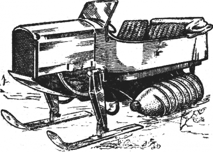 Шнек вместо гусениц. Личный транспорт Справочник / Личный транспорт: наземный, водный, воздушный С каждым годом все интенсивнее идет освоение труднодоступных районов страны, хранящих в своих недрах неисчислимые богатства, столь необходимые народному хозяйству. Разыскивая эти тайники природы, работают многочисленные геологоразведочные партии. Они преодолевают сотни и тысячи километров непроходимой тундры, форсируют болота и топи, не замерзающие и в суровые зимы реки, глубокие снега. В этом им помогают различные транспортные машины - гусеничные вездеходы-амфибии, автомобили высокой проходимости, вертолеты и самолеты. И тем не менее в особо сложных условиях имеющаяся техника часто оказывается бессильной. Приходится использовать вьючных животных, оленьи упряжки, а порой пробираться пешком, надев охотничьи лыжи или снегоступы. Поэтому понятны попытки разработать такой движитель, который обеспечивал бы высокую проходимость не только машинам, но и более простым, малым транспортным средствам, не менее необходимым для работы в отдаленных осваиваемых районах. И движитель подобного рода существует: шнековый, или винтовой. Он, конечно, имеет свои недостатки, но и обладает многими преимуществами. Главное из них - обеспечение вездеходности в таких условиях бездорожья, где все остальные транспортные средства проходимости не обеспечивают. У шнекового движителя есть своя довольно долгая история. Его появление относят к 1900 году, когда русскому изобретателю Ф. Дергинту был выдан патент на сани, приводимые в движение шнеком. Вслед за тем во Франции и Швеции появляются шнековые движители, приспособленные к автомобилям и предназначенные для обеспечения им возможности передвижения по снегу.