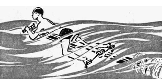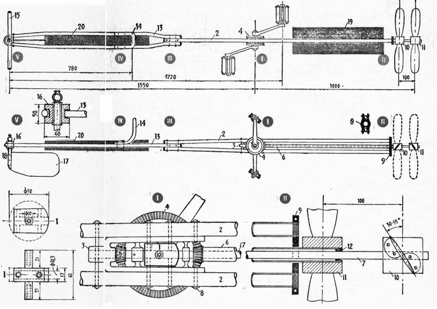 Аквапед. Личный транспорт Справочник / Личный транспорт: наземный, водный, воздушный Уговоримся сразу: плавать вы умеете и глубины не боитесь. Однако вам хочется плавать быстрее, чем позволяет невооруженные руки и ноги или даже ласты. Тогда возьмитесь за постройку аквапеда - водного велосипеда. Он развивает скорость 6-8 км/час. С его помощью можно долго плыть, не ощущая усталости. Аквапеды бывают одновинтовыми и двухвинтовыми. Одновинтовые гораздо проще, их легче изготовить. Но при вращении винта в воде сам аквапед стремится вращаться в другую сторону. На гашение вращательного момента пловцу приходится тратить много усилий. Двухвинтовые аквапеды имеют два одинаковых винта, которые крутятся в разные стороны. Вращающие моменты винтов равны и направлены навстречу друг другу, они гасят друг друга. Двухвинтовой аквапед предлагаемой конструкции весит около 7 кг. Оказавшись без седока, он не может утонуть; он имеет "положительную плавучесть", хотя и небольшую. Плавучесть достигнута тем, что все части его рамы, сделанной из легких дюралевых трубок внешним диаметром около 18-25 мм, полностью герметичны. Кроме того, к раме прикреплены поплавки (19 и 20, см. чертеж), спаянные, например, из консервных банок. Объем поплавков зависит от веса конструкции, он подбирается так, чтобы аквапед плавал на воде почти горизонтально, немного приподняв переднюю часть. Узел I - главный, он передает движение от педалей к винтам. Чтобы не возиться с изготовлением конических шестерен, можно использовать механизмы двух старых дрелей. Ось большой конической шестерни 4 удерживается подшипником 1, который надо выпилить из стали. Корпус 3 крепится к раме 2 винтами М5. Для того чтобы через отверстия креплений вода не попадала внутрь трубок рамы, под головки винтов следует подложить резиновые шайбы. Такие же шайбы подкладываются и под гайки. Подшипник 1 также закрепляется в корпусе 3 винтами М5. Если вы решите делать раму из трубок большого диаметра, их нужно будет слегка сплющивать в месте крепления корпуса 3, чтобы зацепить две большие конические шестерни 4 с коническими шестеренками 5 меньшего диаметра. Эти шестерни вращаются в разные стороны. Передняя шестеренка 5 штифтом закреплена на оси 7 - длинном стержне из стали или дюралюминия диаметром 10 мм. Ось 7 свободно вращается в сквозном отверстии подшипника 1 и в оси-трубке 6, также стальной. Задняя шестеренка 5 припаяна тугоплавким припоем или приварена торцом к оси-трубке 6. Внутренний диаметр этой оси должен быть около 12-14 мм, чтобы ось 7 могла легко вращаться в трубке. Внешний диаметр оси-трубки 14-18 мм. Шестерни 4 надеты на винты, ввернутые в подшипник 1. К шестерням прикреплены винтами или приварены педали от какого-либо велосипеда, например "Орленка". Планки педалей надо слегка отогнуть молотком в тисках, чтобы увеличить расстояние между педалями. Винтовой узел II включает два гребных винта с двумя, тремя или четырьмя лопастями в каждом. Лопасти делаются из листового дюралюминия толщиной 1,5-2,5 мм. Они крепятся винтами на втулках 10 и 11, выточенных из дюралюминия, под углом 60° к оси втулки. Лопасти винтов следует опиливать все сразу, сложив заготовки в пакет. Обратите внимание на подшипник 9. Делать его надо из листовой латуни или бронзы; в нем должна свободно вращаться ось 6. Подшипник 9 закрепите на трубках рамы 2 хомутовыми зажимам