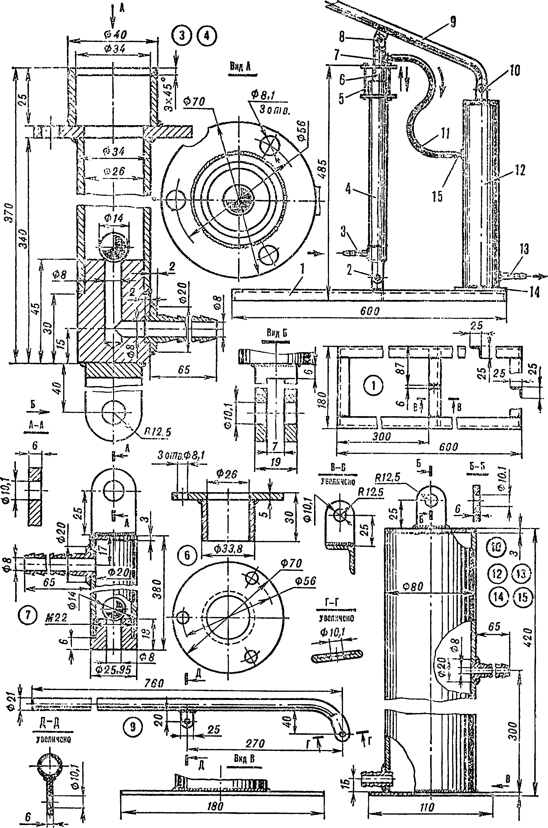 Рис. 1. Насос с полым поршнем (нажмите для увеличения): 1 - рама, 2 - шарнир цилиндра, 3 - всасывающий штуцер цилиндра, 4 - цилиндр, 5 - болт стяжки М3 (3 шт.), 6 - крышка сальника, 7 - шток, 8 - шарнир штока, 9 - ручка, 10 - шарнир ручки, 11 - нагнетающий шланг, 12 - ресивер, 13 - выходной штуцер, 14 - дно ресивера, 15 - нагнетающий штуцер