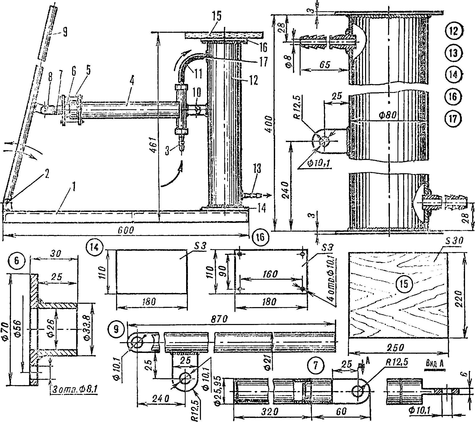 Рис. 2. Вакуумный насос (нажмите для увеличения): 1 - рама, 2 - шарнир ручки, 3 - всасывающий штуцер цилиндра, 4 - цилиндр, 5 - болт стяжки М8 (3 шт.), 6 - крышка сальника, 7 - шток, 8 - шарнир штока, 9 - ручка, 10 - шарнир цилиндра, 11 - нагнетающий шланг, 12 - ресивер, 13 - выходной штуцер, 14 - дно ресивера, 15 - сиденье, 16 - крышка ресивера, 17 - нагнетающий штуцер.