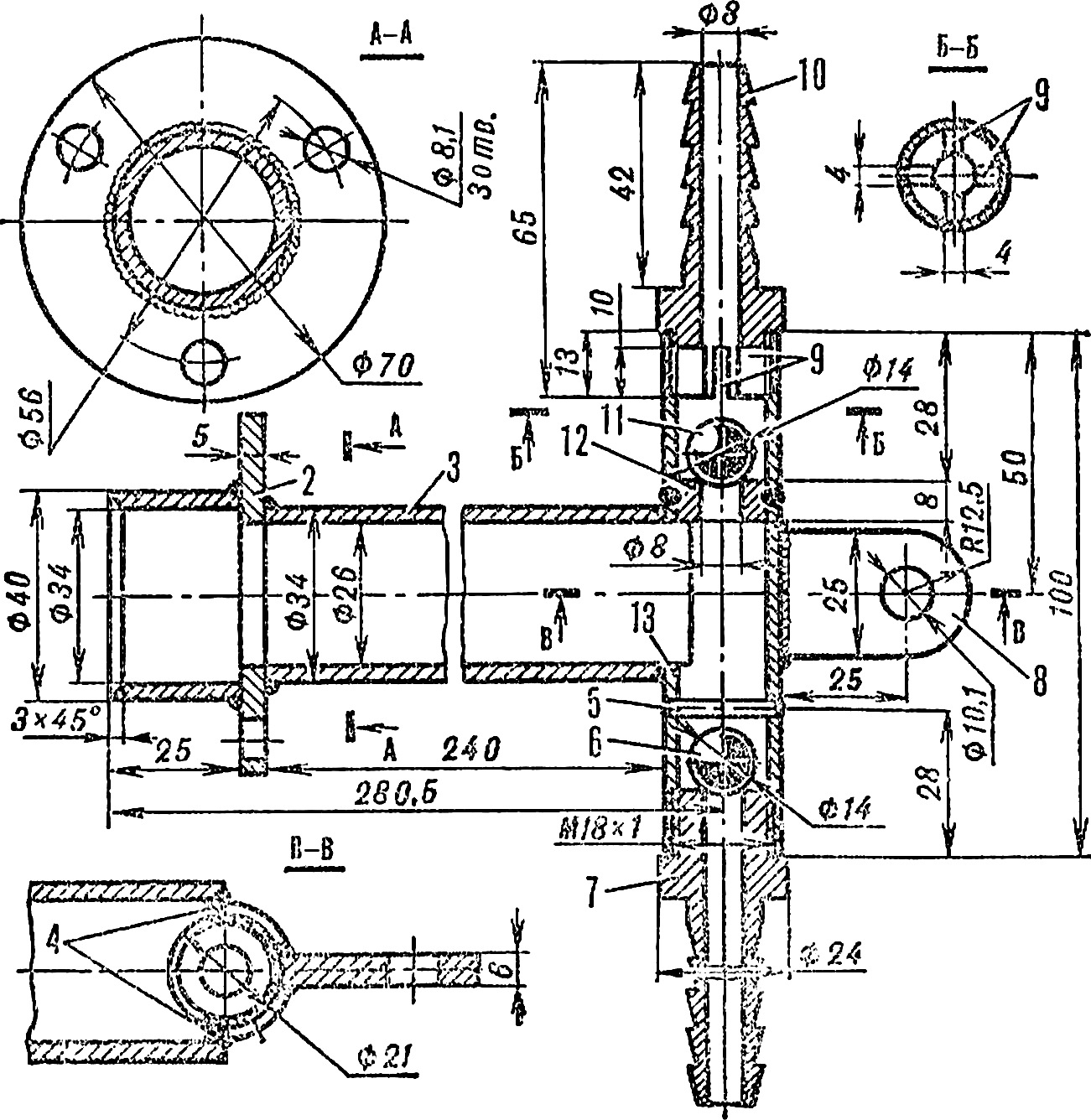Рис. 3. Конструкция вакуумного цилиндра (нажмите для увеличения): 1 - корпус сальника, 2 - фланец, 3 - цилиндр, 4 - донная заглушка (2 шт.), 5 - штырь-ограничитель хода шарика всасывающего клапана, 6, 11 - шарики клапанов, 7 - всасывающий штуцер, 8 - ушко шарнира, 9 - радиальные прорези, 10 - нагнетающий штуцер, 12 - гнездо шарика нагнетающего клапана, 13 - корпус клапанов