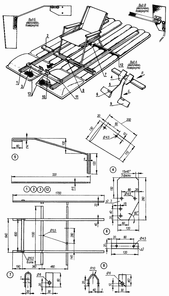 После того, как рама-основание собрана, на ее среднюю и заднюю поперечину устанавливается раскладное кресло и прикрепляется металлическими хомутами из стальной или дюралюминиевой полосы.