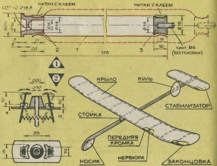 Воздушно-гидравлический планер. Личный транспорт Справочник / Личный транспорт: наземный, водный, воздушный Прежде чем приступать к постройке планера, вычертите на миллиметровой бумаге отдельные части модели в натуральную величину: половину крыла, стабилизатор, киль, носик, нервюру. Закончив чертежные работы, приступайте к постройке модели. Начните с фюзеляжа. Фюзеляж склеивается из двух деталей: рейки и носика. Для рейки подберите сосновый брусок длиной 900 мм. Брусок обработайте так, чтобы по всей длине его сечение было 8x6 мм, а затем, начиная с середины, обстругайте так, чтобы на одном конце его сечение было 5x4 мм. Через копирку переведите контур носика с чертежа на дощечку толщиной 6-8 мм. Лобзиком аккуратно выпилите носик по контуру. Готовую деталь хорошенько зачистите напильником. Готовую рейку приклейте к верхней части носика и соедините детали двумя - тремя мелкими гвоздиками. Как только клей высохнет, зачистите фюзеляж мелкой шкуркой, а затем покрасьте яркой нитроэмалью. Фюзеляж готов - приступайте к хвостовому оперению. Обод стабилизатора собирается из двух реек-кромок и двух законцовок - так обычно моделисты называют скругленные части крыла и стабилизатора. Сечение реек 4x2,5 мм в середине и 3x2 мм на концах. Законцовки выгните из стальной проволоки диаметром 0,5-0,8 мм на трубе диаметром 35 мм. Концы проволочных заготовок расклепайте на длине 10-15 мм или заточите напильником и загните под прямым углом. Готовые законцовки закрепите нитками с клеем на концах реек - кромок. Теперь проверьте, не перекошен ли каркас стабилизатора, если нет - можете прикрепить его к фюзеляжу нитками с клеем. Для каркаса киля подберите проволоку диаметром 0,8 мм и длиной 360 мм. Он тоже крепится на фюзеляже нитками с клеем. Далее приступайте к изготовлению крыла. Сначала выстругайте две рейки сечением 5x3 мм и длиной 1150 мм для кромок и одну сечением 4x2 мм и длиной 1100 мм для нервюр. Чтобы крыло получилось достаточно эластичным и одинаково прочным по всей длине, рейки для крыла нужно слегка состругать так, чтобы сечение на концах было 3x2 мм. Законцовки для крыла изготовьте таким же способом, как и для стабилизатора. Диаметр проволоки желательно увеличить до 0,8-0,9 мм. Разметьте рейки по чертежу, лишнее отрежьте, а концы обработайте, как показано на рисунке. Кромки крыла готовы. Теперь закрепите на них законцовкн нитками с клеем. После того как клей высохнет, разметьте на кромках места расположения нервюр и изгибы. Концы крыла согните. Чтобы изгибы получились плавными, прогрейте рейки паяльником на длине 30-35 мм. Проследите, чтобы V - образные углы с обеих сторон получились одинаковыми. Следующая операция - изготовление нервюр. Нарежьте из рейки заготовки длиной на 3-5 мм больше, чем надо по чертежу. Концы нервюр заточите. В кромках крыла острым ножом проделайте для нервюр пазы. Затем приклейте нервюры к ободу крыла, как показано на рисунке. Места стыков промажьте клеем. Теперь согните нервюры, подержав их над разогретым паяльником. Каждой нервюре придайте профиль, изображенный на нашем рисунке. Ширину профиля замерьте линейкой, положив крыло на поверхность стола. Итак, каркас собран. Прежде чем закрепить крыло на фюзеляже, вам придется изготовить еще планку сечением 7X6 мм с пазами (см. рис.). Готовую планку закрепите нитками с клеем на фюзеляже. Перед обтяжкой каркас мод