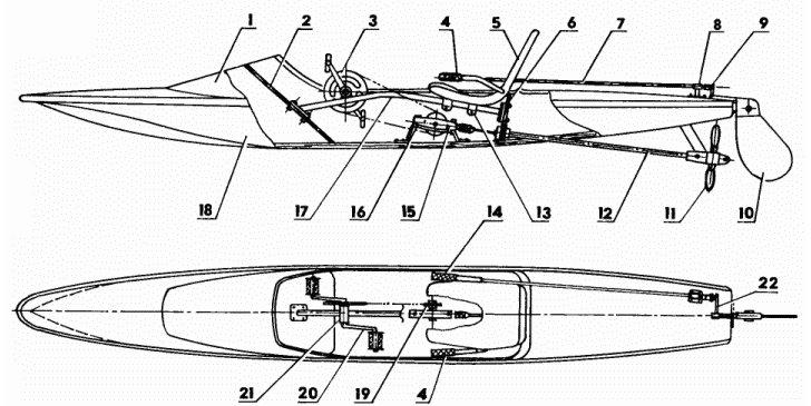 Быстроходный аквапед. Личный транспорт Справочник / Личный транспорт: наземный, водный, воздушный Суда, использующие для движения мускульную силу человека, никогда не относились к разряду скоростных. Исключение составляют разве что гоночные лодки для академической гребли, являющиеся наиболее быстроходными из судов-мускулоходов. Благодаря их удачной конфигурации и наиболее полному использованию мышечной энергии спортсменов, лодки-"восьмерки" способны на двухкилометровой дистанции развивать скорость до 12 узлов. Но это отнюдь не означает, что такая скорость является пределом возможностей движения человека по водной поверхности. Если отойти от канонических конструкций гребных судов, предназначенных для официальных соревнований, то появляется возможность создания аппаратов-мускулоходов, развивающих скорость до 20 узлов! При проектировании скоростных безмоторных судов конструктору приходится решать две основные задачи: создание эффективного движителя и изготовление корпуса с минимальным сопротивлением движению. Дальнейшее совершенствование весельного движителя вряд ли может привести к сколько-нибудь заметному росту его эффективности. Цикличность действия весла, проскальзывание его в воде при гребке, аэродинамическое сопротивление при нерабочем (обратном) ходе, потери при входе лопасти в воду в начале гребка и при выходе из воды в конце - все это приводит к тому, что коэффициент полезного действия этого движителя составляет лишь около 65 процентов. Заметно большим кпд обладает гребной винт. Мало кому известно, что гребным винтом с мускульным приводом еще в начале минувшего века оснащались обычные весельные лодки. Достоинства его очевидны: у него отсутствуют цикличность рабочего хода, а так называемый упор лопастей винта при его вращении постоянен. К тому же при сравнительно небольшой мощности привода и малой частоте вращения можно использовать низкооборотные гребные винты большого диаметра с узкими лопастями - коэффициент полезного действия такого движителя доходит до 90 процентов.