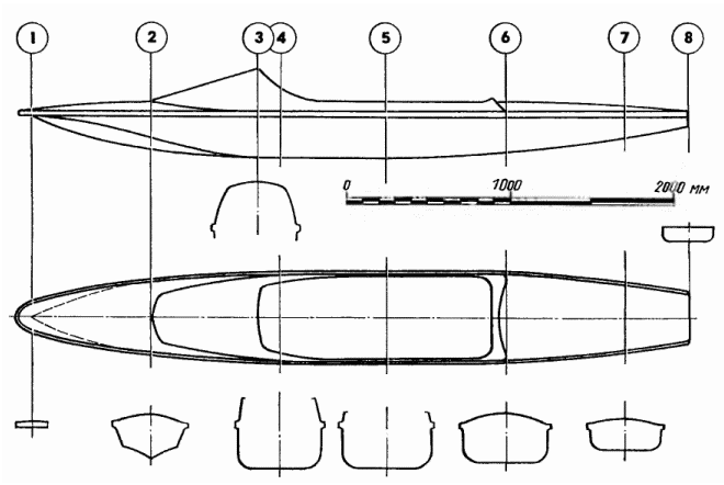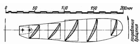 При создании корпуса с малым сопротивлением движению нужно учитывать, что перемещение его на границе двух сред вызывает большое волновое сопротивление. Избавиться от него можно, переместив корпус полностью в одну из сред - под воду либо в воздух. В первом случае придется создавать аппарат, состоящий из движущегося под водой обтекаемого поплавка с гребным винтом и расположенного над ним, в воздушной среде, сиденья с педальным узлом привода. Во втором - создавать педальный глиссер или аппарат на подводных крыльях. Нужно сказать, что все эти схемы в свое время были реализованы конструкторами, и наиболее скоростные (с подводными крыльями) мускулоходы развивали скорость до 13 узлов! Впрочем, все эти рекордные аквапеды, сконструированные для достижения наивысшей скорости, вряд ли когда-нибудь смогут найти практическое применение. Дело в том, что они обладают или неудовлетворительной остойчивостью, или недостаточным водоизмещением, и для движения на таком аппарате требуется специальная подготовка. Наша же цель состояла в создании скоростного мускулохода, способного стать настоящим водным велосипедом, управлять которым сможет практически любой человек. Водоизмещающий корпус аквапеда выполнен предельно удобообтекаемым, с большим соотношением длины к ширине. Для того, чтобы он получился легким, целесообразно сделать его методом выклейки на болване. Сам же болван проще всего изготовить из древесины, цемента и гипса.