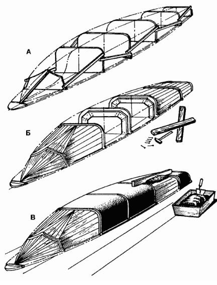 Прежде всего нужно сделать основание для болвана - им может стать участок ровного пола в сарае, а лучше - щит из ровных досок: его длина 4,5 и ширина 0,7 м. В соответствии с теоретическим чертежом на щите изображается ось симметрии (диаметральная плоскость) корпуса и перпендикулярно ей - линии расположения шпангоутов. Последние выпиливаются из фанеры толщиной 6-8 мм; на щите они временно закрепляются с помощью планок-раскосов.