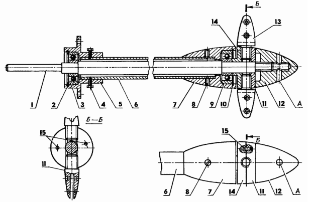 На аквапеде выгоднее всего использовать гребной винт диаметром 400 мм с узкими лопастями, вырезанными из листового дюралюминия толщиной 4 мм. Такие винты наиболее эффективны при небольшой передаваемой мощности и малой нагрузке на лопасть и имеют кпд свыше 90 процентов! Заготовка сначала изгибается в соответствии с формой вогнутой части лопасти винта и закручивается, после чего выпуклой ее части придается профиль в соответствии с теоретическим чертежом гребного винта. Готовые лопасти закрепляются на ступицах алюминиевыми заклепками, а при регулировке шага винта устанавливаются строго под одним углом к оси втулки с помощью шаблона. Оптимальный шаг винта подбирается в пробных заездах.