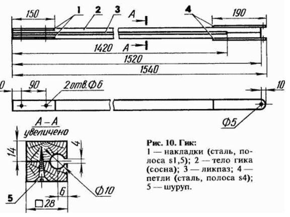 ГИК (рис.10) изготовьте по той же технологии, что и мачту: распилите сосновый брусок сечением 30x30 мм вдоль на две одинаковые планки. Выстругайте ликпаз и щель ликпаза. Соедините планки клеем и ошкурьте гик так, чтобы довести его сечение до 28x28 мм. Укрепите клеевой шов шурупами. Снабдите передний конец гика петлями - стальными полосами с отверстиями для соединения с вертлюгом гика, расположенным на мачте, а задний конец - стальными накладками для стыковки с ноком гика (крепление петель и накладок - мелкими шурупами, не показанными на рисунках). Надо заметить, что алюминиевый штырь диаметром 5 мм, соединяющий гик с вертлюгом, должен довольно плотно входить в отверстия петель и свободно - в отверстие вертлюга.