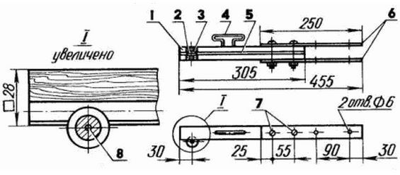 Выстругайте бимсы - четыре бруска сечением 75x30 мм и длиной 1380 мм. Оптимизируйте их массу, сострогав "на ус" концы (рис. 3). Положите бимсы на стрингеры и также пометьте: первый от носа бимс слева - "Л1, справа - "П1". Второй - "Л2" и "П2". И так далее. Просверлите отверстия - такие же, как в стрингерах. Сделайте подрундучники: носовые - сечением 58x24 мм и длиной 1010 мм, кормовые - сечением 45x23 мм и длиной 770 мм. Пометьте их какими-либо надписями.