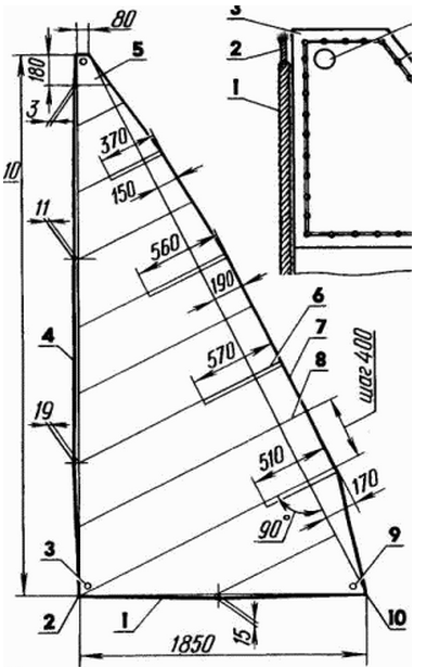 ШВЕРТОВЫЙ КРОНШТЕЙН (рис.18) может быть цельным, вырезанным из дюралюминиевого тавра подходящих размеров, или составным, склепанным из нескольких более простых профилей. Здесь это не принципиально. Главное, чтобы шипы швертового кронштейна плотно входили в отведенные им отверстия швертовой балки, а радиусный крюк надежно удерживал кронштейн на балке.