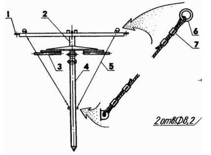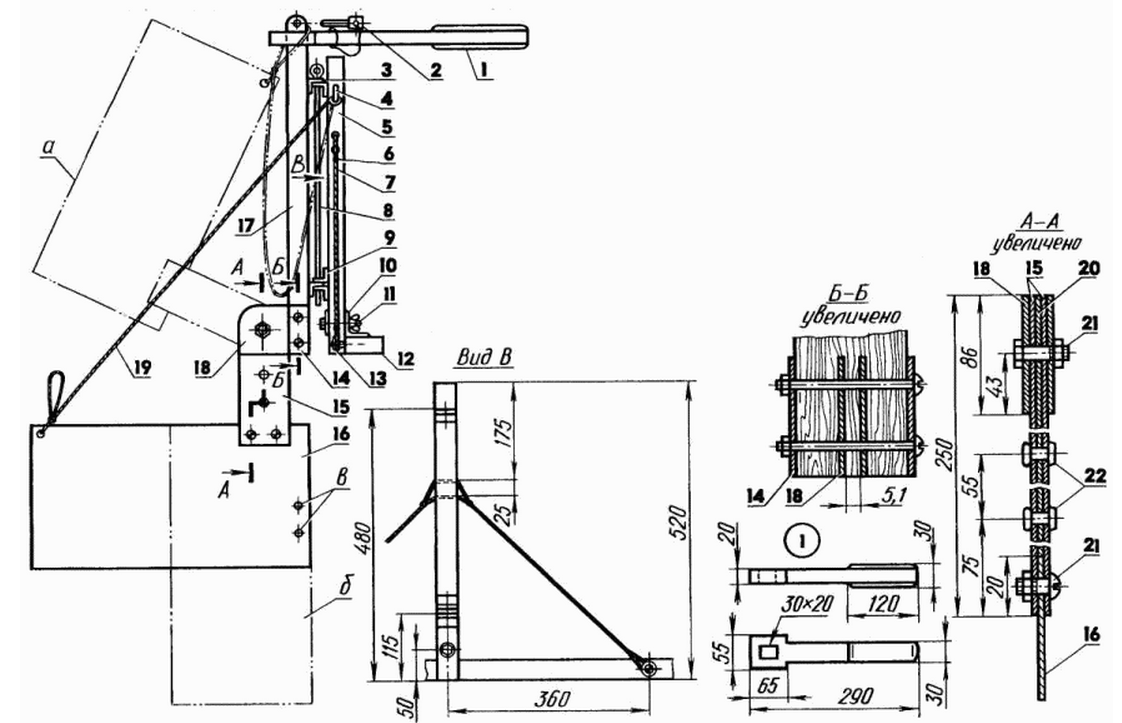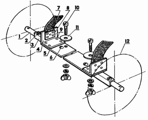 СТАБИЛИЗАТОР растяжек (рис.19) - необходимейшая часть швертового устройства. Он обеспечивает одинаковое натяжение тросиков при любом положении шверта. Тогда шверт эффективно противостоит поперечным (боковым) силам, старающимся опрокинуть катамаран на борт. В опущенном состоянии шверта трубки стабилизатора держат тросики натянутыми, препятствуя смещению шверта назад при увеличении скорости (вперед его не пускает упор) и тем самым - изменению положения центра бокового сопротивления катамарана. Конструкция стабилизатора проста и в особых комментариях не нуждается.