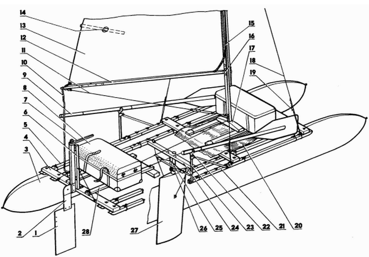 В собранном виде катамаран, который был назван "Царевна Лягушка", предстаален на рисунке 2. Управлять им довольно просто и необыкновенно интересно. Парус площадью 4 м2 обеспечивает хорошую скорость при умеренном ветре и достаточную безопасность при шквальном. Так что за пассажиров можно не волноваться. "Матросами" катамарана, например, были мой пятилетний ребенок, жена, страдающая водобоязнью, и девяностолетний тесть. Если вы решите построить себе подобное плавсредство, то особых столярных и слесарных навыков для этого вам не потребуется. Но время, аккуратность и трудолюбие будут необходимы. Подберите качественный материал. Предпочтительна сосна: за ровные слои ее древесины без сучков и малый удельный вес. При достаточной прочности и упругости. Желательна древесина многолетней выдержки в сухом месте. Сырую не используйте - ее обязательно "поведет", и все будет безнадежно испорчено. РАМА. Целесообразно начинать с нее. Рама состоит из четырех продольных брусьев - стрингеров и четырех поперечных - бимсов. Стрингеры цельные слишком длинны и неудобны при транспортировке, поэтому их лучше сделать составными из двух частей. Длина частей различна, так как на соединяющих их уголках крепятся подуключены, находящиеся на удобном для гребца расстоянии. Аккуратно выстругайте, следя за тем, чтобы не было перекоса, восемь брусков сечением 40x40 мм: четыре из них (длиной по 1340 мм) будут носовыми частями стрингеров, четыре (длиной по 1110 мм) - кормовыми. Приготовьте четыре дюралюминиевых уголка 40x40x4 мм длиной 500 мм. Для соединения частей стрингеров с уголками понадобятся 16 болтов М8 длиной 50 мм с гайками-барашками", металлическими шайбами диаметром 20 и толщиной 2,5 мм и резиновыми амортизационными шайбами толщиной 2,5 мм, диаметр которых равен диаметру головки болта. Положите уголки на стрингеры: середина длины каждого уголка должна совпадать со стыком их частей. Вертикальные полки уголков должны располагаться так: на первом и третьем стрингерах - слева, на втором и четвертом - справа. Кстати, стык частей каждого стрингера неплотный - с зазором. Без него в нижней части стыка на волнах произойдет сильное сжатие, и соединительный уголок может повырывать болты. Поэтому на время сверления отверстий вставьте для образования зазора технологические вкладыши из фанеры толщиной 4 мм. Но как бы вы не старались, просверлить отверстия абсолютно точно не удастся. Поэтому, чтобы не перепутать части стрингеров при последующих многократных сборках-разборках, пометьте их. Если стать в корме, то слева будет первый стрингер. Четко надпишите его носовую часть: "Н1", а кормовую - "К1". Второй стрингер - "Н2" и "К2". И так далее. Обозначьте также соединительные уголки лунками, сделанными сверлом: "о", "оо", "ооо" и "оооо". Болты в отверстия не должны входить плотно. С одной стороны, необтертая древесина на воде обязательно набухнет и при разборке рамы отверстия неизбежно будут испорчены. С другой - болтам не нужна и лишняя свобода, расшатывающая конструкцию. Чтобы головки болтов не прорвали поплавки, их надо "утопить" в тело стрингера. Глубина гнезда под головку должна равняться сумме толщин металлической и резиновой шайб и головки, диаметр - четко по диаметру металлической шайбы - 20 мм. Последнюю обязательно приклейте к дереву "эпоксидкой" с усилием завинченного болта. Если гнездо будет 